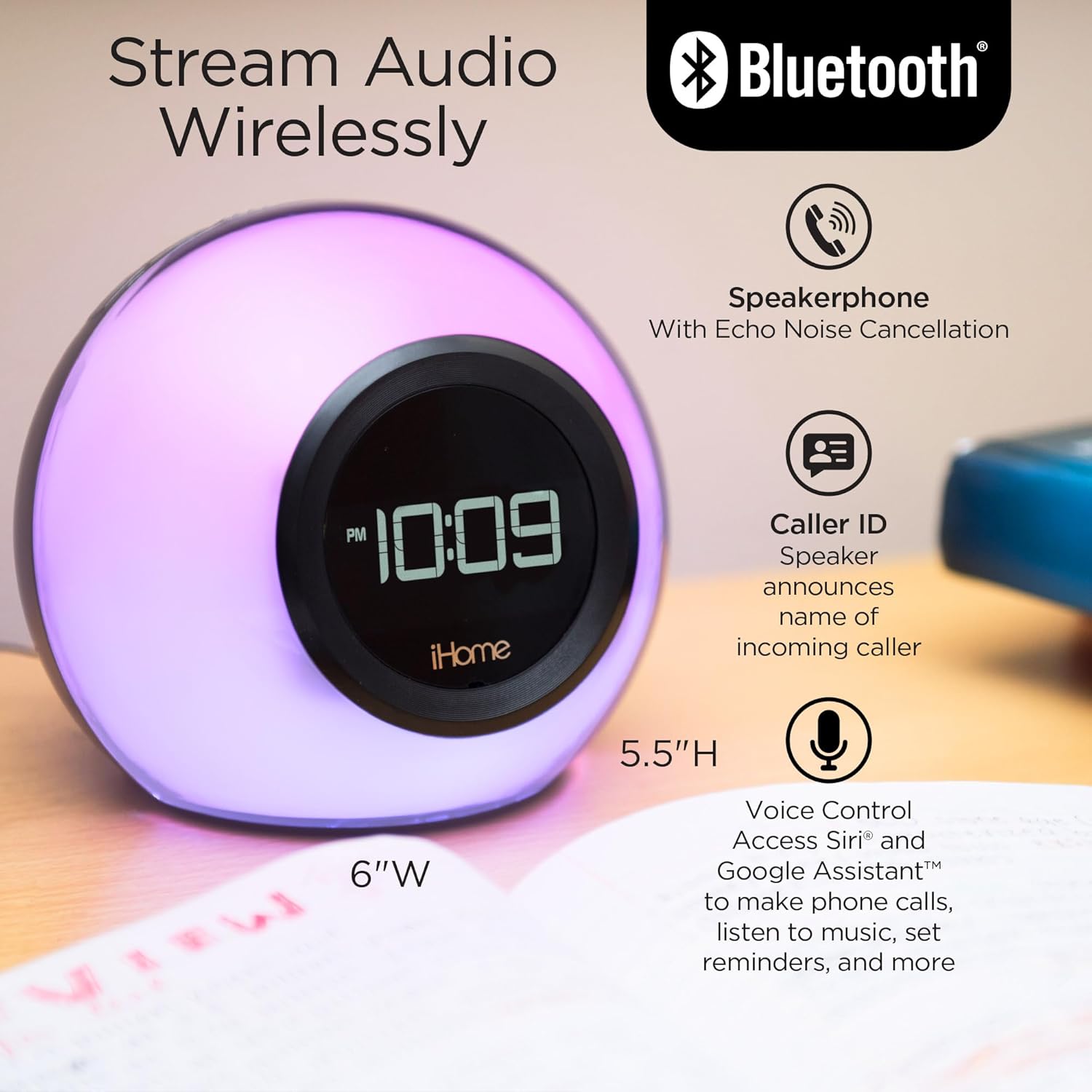 iHome Alarm Clock Radio with Bluetooth Speaker and Color Changing Lamp, USB Charging, and Speakerphone for Home, Office, or Dorm (IBT29BX6)