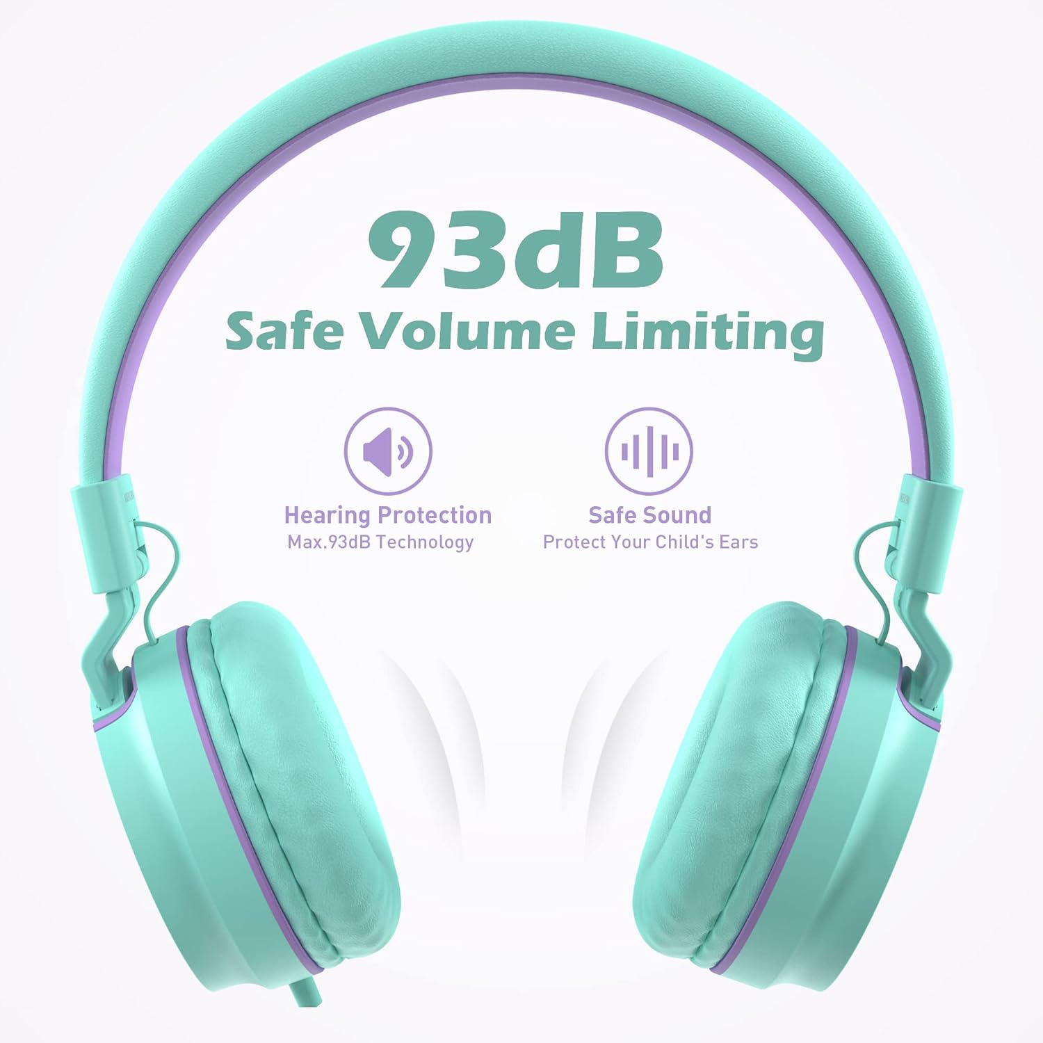 Kids Headphones, AILIHEN I35 On-Ear Headphones for School, 93dB HD Mic Stereo Headphone for Kid Girls Children, Foldable Wired 3.5mm for Chromebook, Laptop, Computer, Tablet (Green Purple)