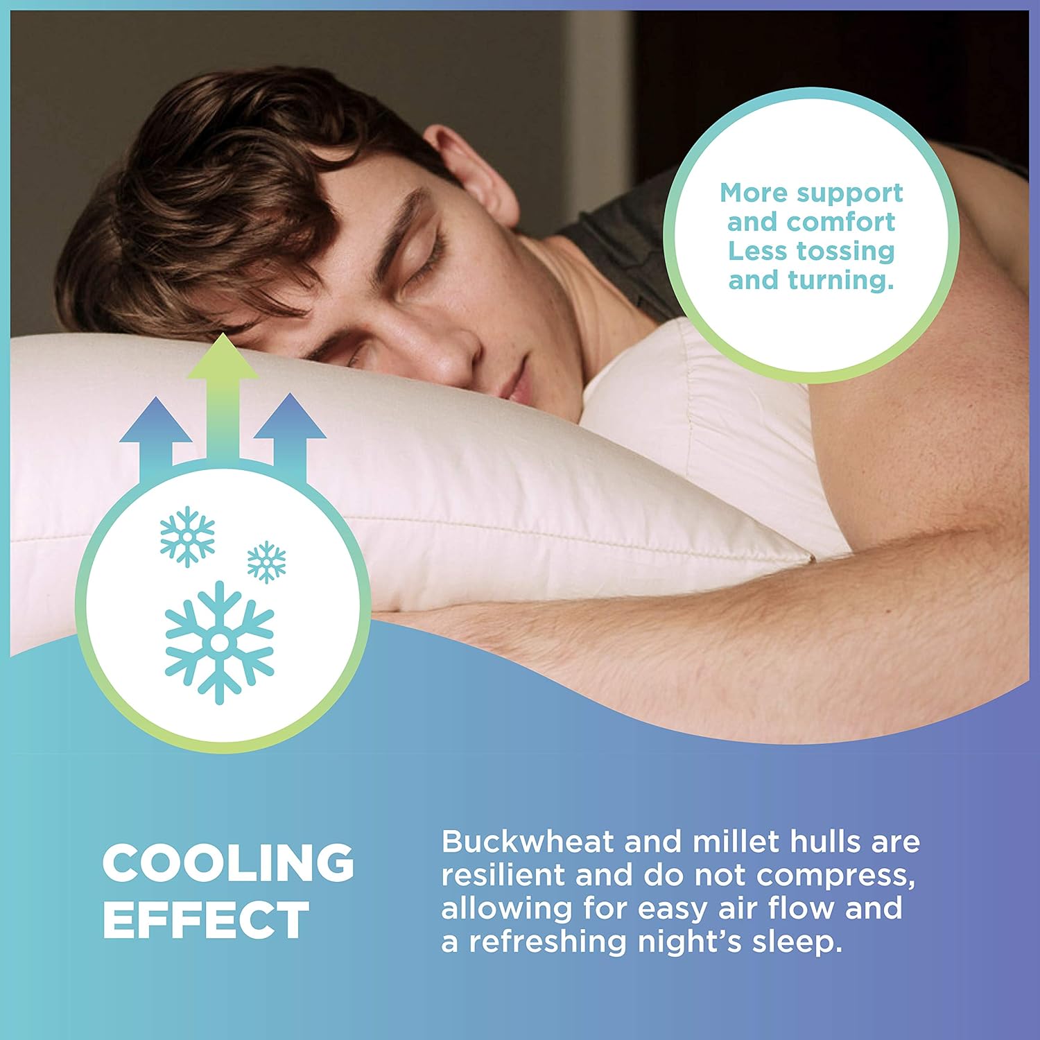 - ๐๐๐๐๐๐๐๐๐ ๐๐๐๐๐๐: This 20" x 30" sleeping pillow features the soft and supportive feel of organic millet hulls, cradling your head, neck, and shoulders. The ergonomic design helps reduce neck pain and promotes deeper, more comfortable sleep.