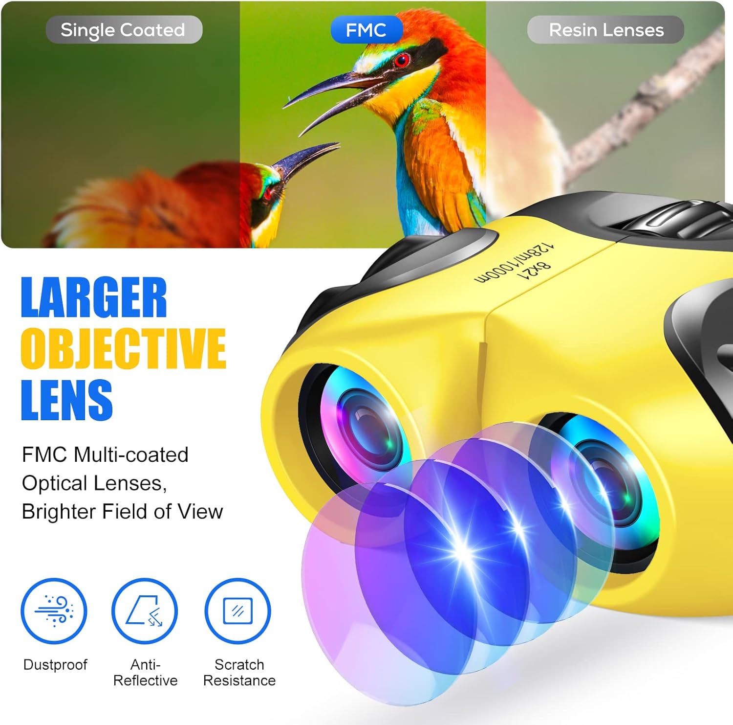 - Real binoculars for kids: this product has a superb Magnification of 8x with an amazing view. The binoculars can be adjusted to easily match the eye distance gap for each kids. Great for bird watching, hunting, hiking, traveling and enjoying the wilderness