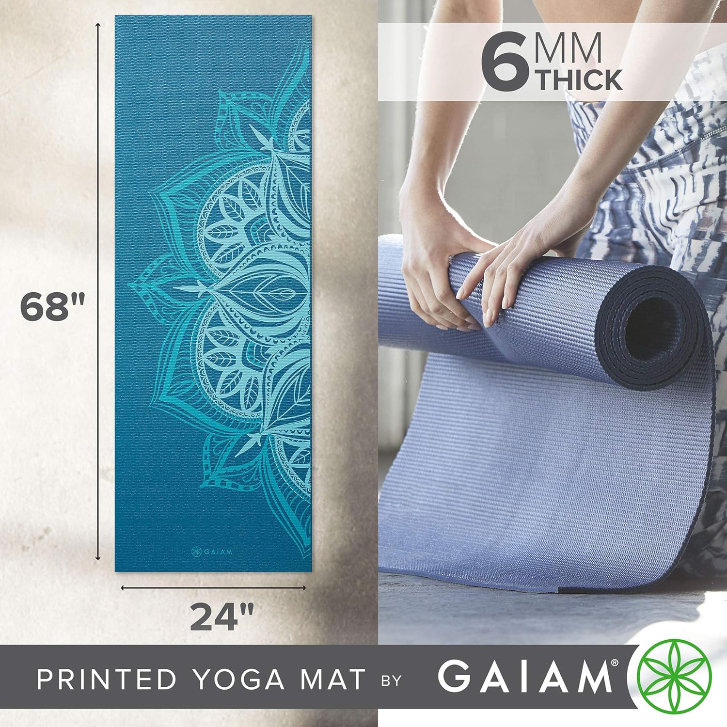 Gaiam Yoga Mat - Premium 6mm Print Extra Thick Non Slip Exercise & Fitness Mat for All Types of Yoga, Pilates & Floor Workouts (68"L x 24"W x 6mm Thick)