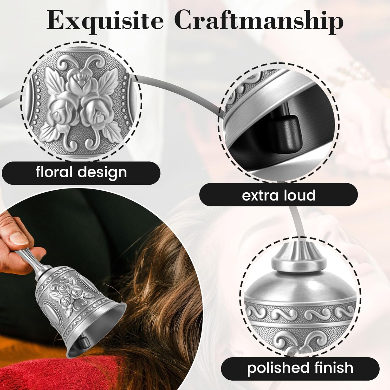 - EYE-CATCHING - Our Extra-Loud and Multi-Purpose Hand Call Bell comes with floral design, vintage style. Vivid patterns engraved on the bell are riveting, enthralling and appealing.