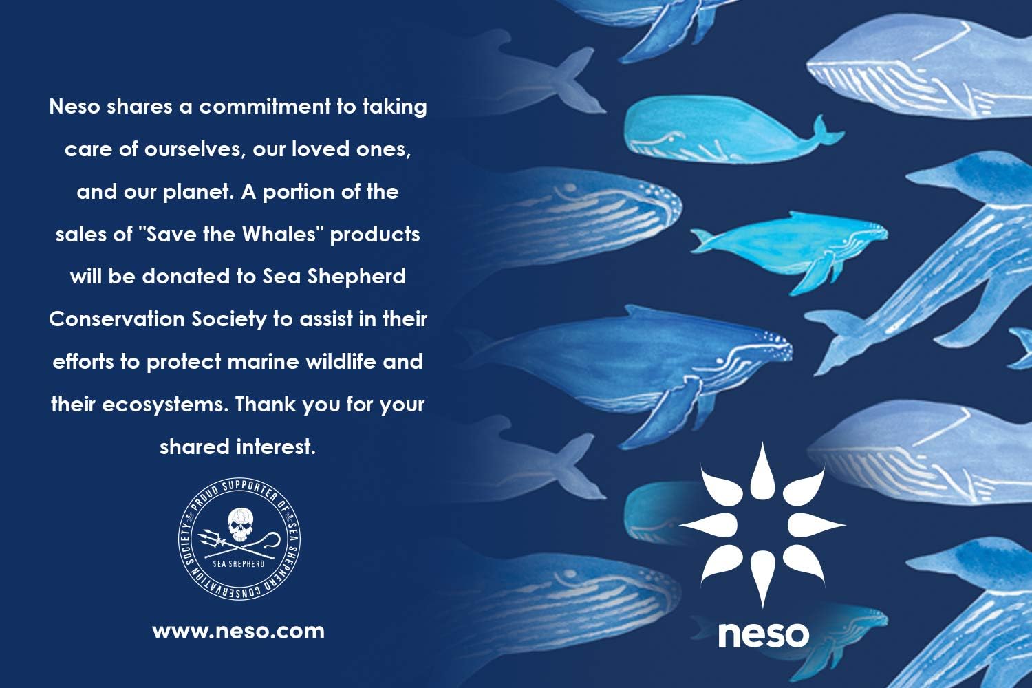 - GIVE BACK. Neso shares a commitment to taking care of ourselves, our loved ones , and our planet. A portion of the sales of "Whales" products will be donated to Sea Shepherd Conservation Society to assist in their efforts to protect marine wildlife and their ecosystems. Thank you for your shared interest.