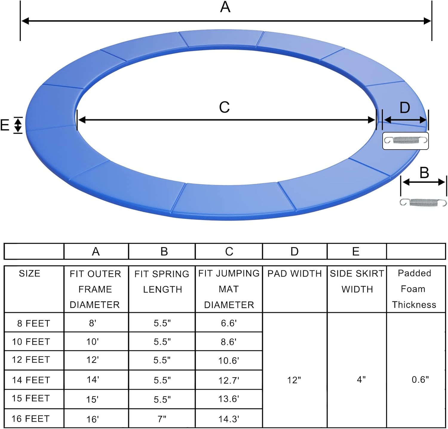 - [ Easy to Assemble & Replace ] Our 12 Ft trampoline safety pad has a folding design, which helps to reduce a lot of tedious assembly steps. All you need to do is lay it flat on the trampoline and fix the 36 elastic ropes. The simple replacement process will not waste your too much time and energy.