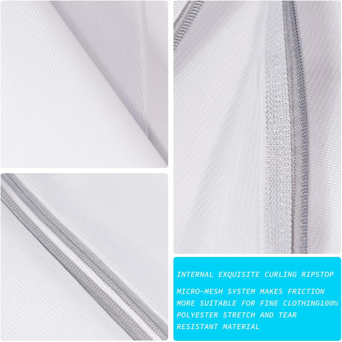- 【100% Polyester Fine Mesh】: This reusable laundry net bag is perfect for packing heavy duty clothes. The extra large laundry bag is made from stain, stretch and tear resistant material -- 100% polyester. Soap and water flow easily through mesh for optimal cleaning, meanwhile protecting delicates from snagging,tangling, or stretching in washer. This large mesh laundry bags are durable and they will protect your finest clothes for years.