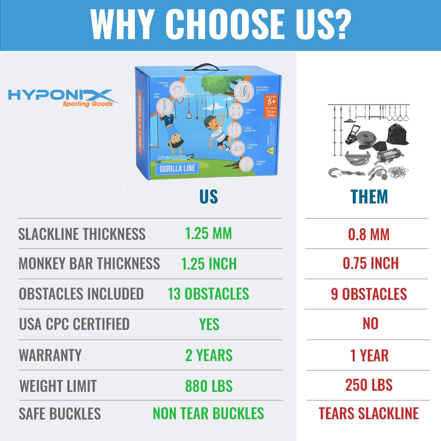 Hyponix Ninja Obstacle Course for Kids – 2 x 60 ft Slacklines with 13 Weatherproof Obstacles – Monkey Net, Ratchet-Tight Tech, Supports 880 lbs – Climbing & Swinging Backyard Fun