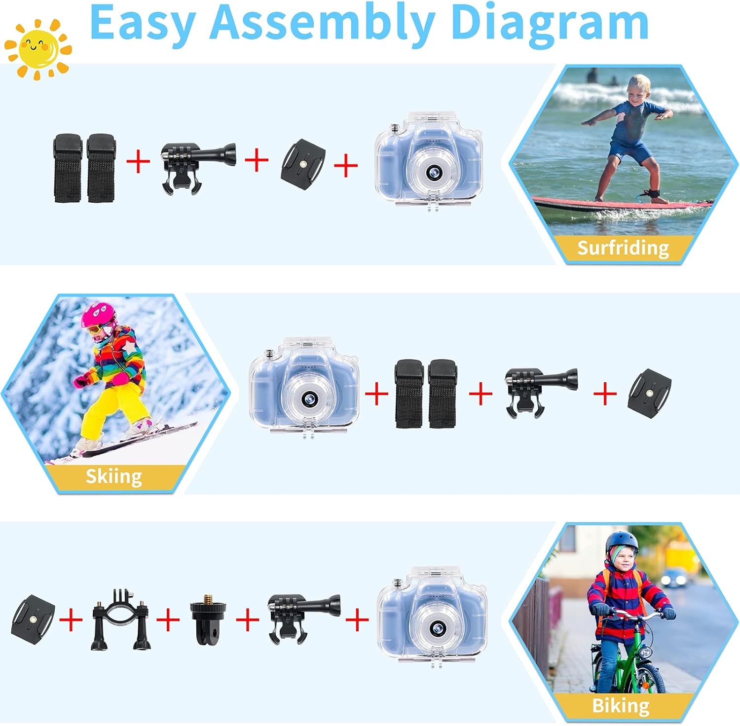 - 📷【Package & Best Service】Kids waterproof camera include: 1* kids camera, 1* waterproof case, 1* Bicycle stand, 1*Adapter, 1*Helmet mount, 1*Helmet base, 2*Helmet bandage, 1*USB cable, 1*32GB SD Card, 1*Card Reader, 1*Manual, 1* Lanyard. And if you have any question about the kids camera, please feel free contact with us, we will solve it within 24 hours.