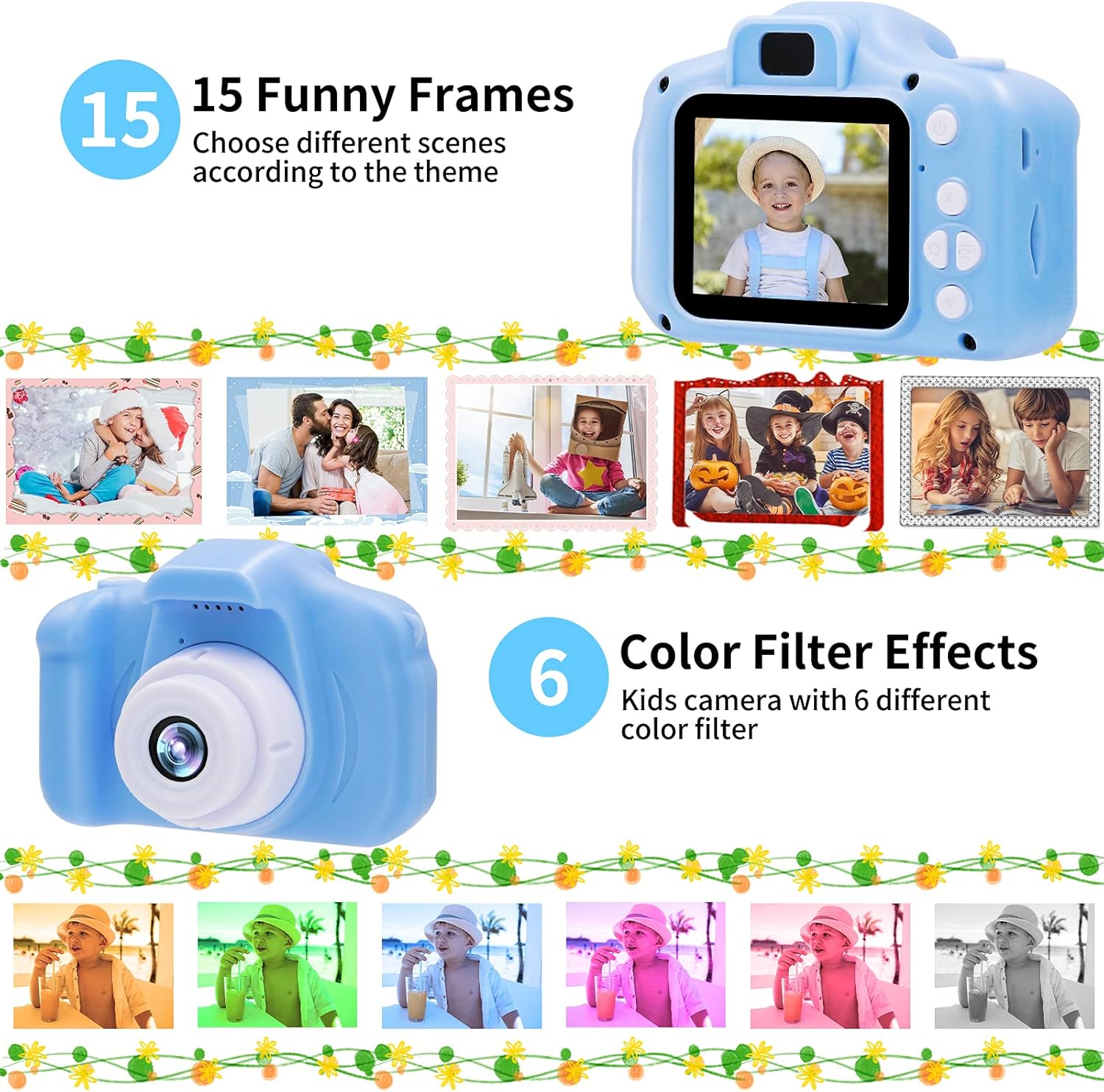 - 📷【Multi-functional Kids Underwater Camera & USB Rechargeable】Underwater camera with many cute and funny functions, such as, 15 funny frames, 6 different filters, 5 puzzle games, photo capture, video recording, playback, time-lapse, and date setting. USB rechargeable battery, easy to carry, no need to worry about power failure.