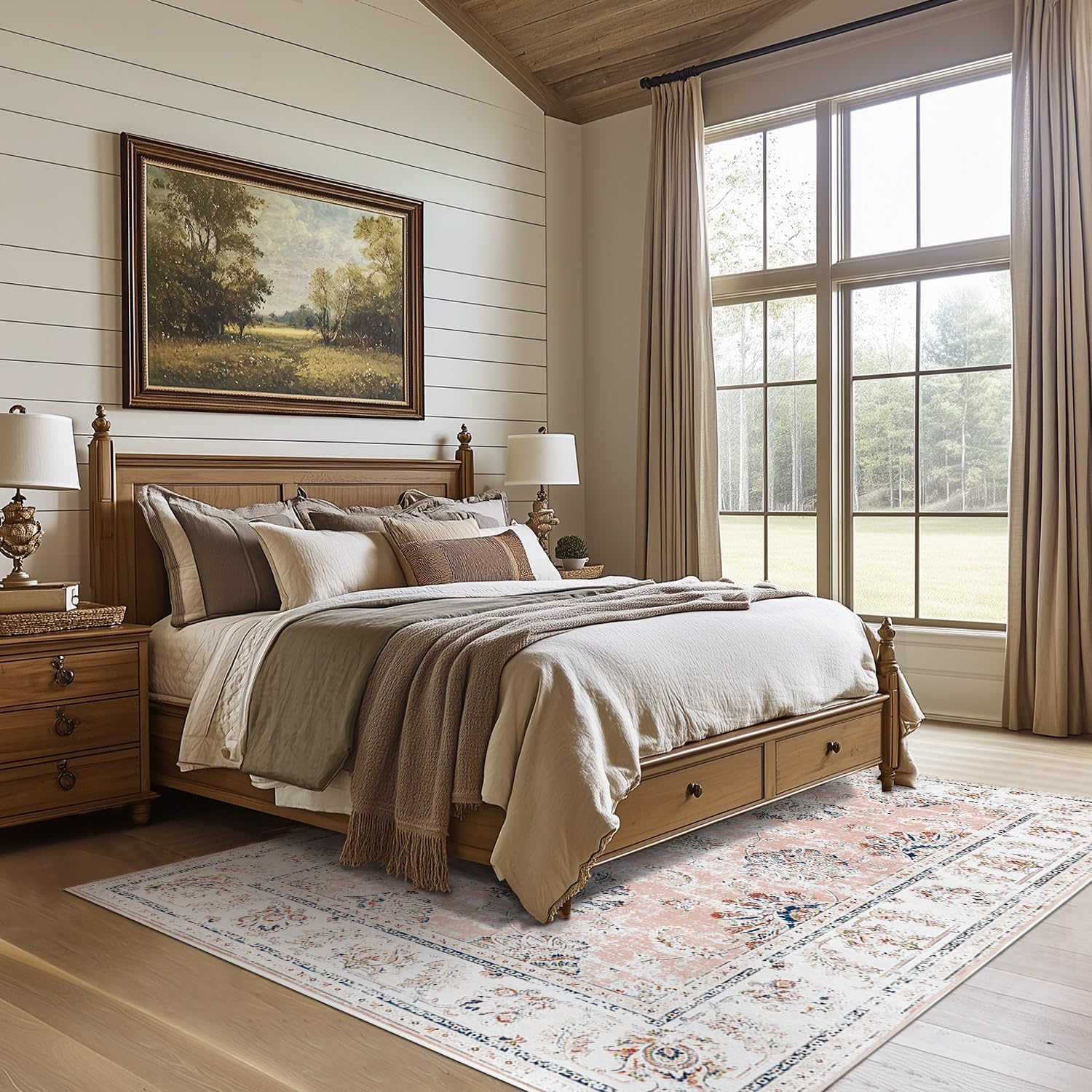 jinchan Vintage Floral 5x7 Area Rugs for Bedroom - Machine Washable Distressed Design Stain Resistant Boho Carpet Ultra-Thin Low Pile Non-Slip for Living Room Dining Room Kitchen (5‘x7',Pink)