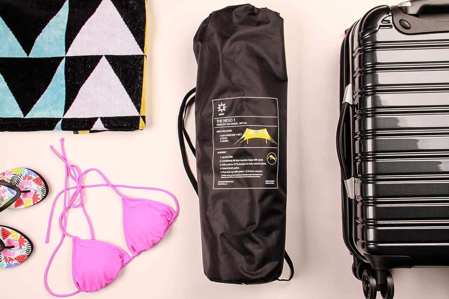 - 7 x 7 NESO TENT (Color). Made for the outdoors, your Neso Tent weighs in at 4 lbs/ 19.5 inches. It can easily fit over your shoulder or in your carry-on. Use sand or rocks to stabilize, so you’ll always have shade for your next adventure.