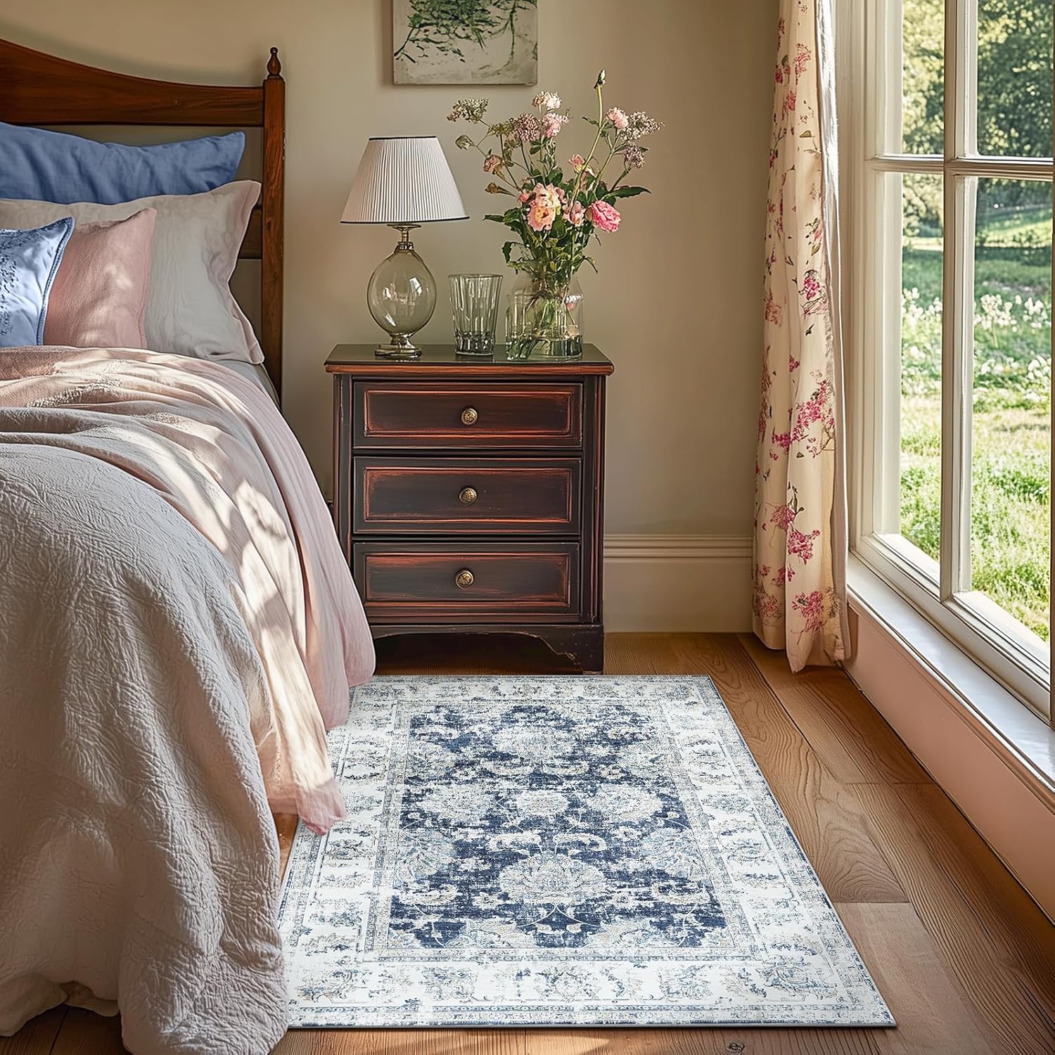 jinchan Floral 3x5 Area Rugs for Entryway - Machine Washable Taupe Vintage Distressed Design Doormat Non-Slip Ultra-Thin Low Pile Boho Rug for Kitchen Living Room Bedroom Farmhouse (3‘x5',Dark Blue)