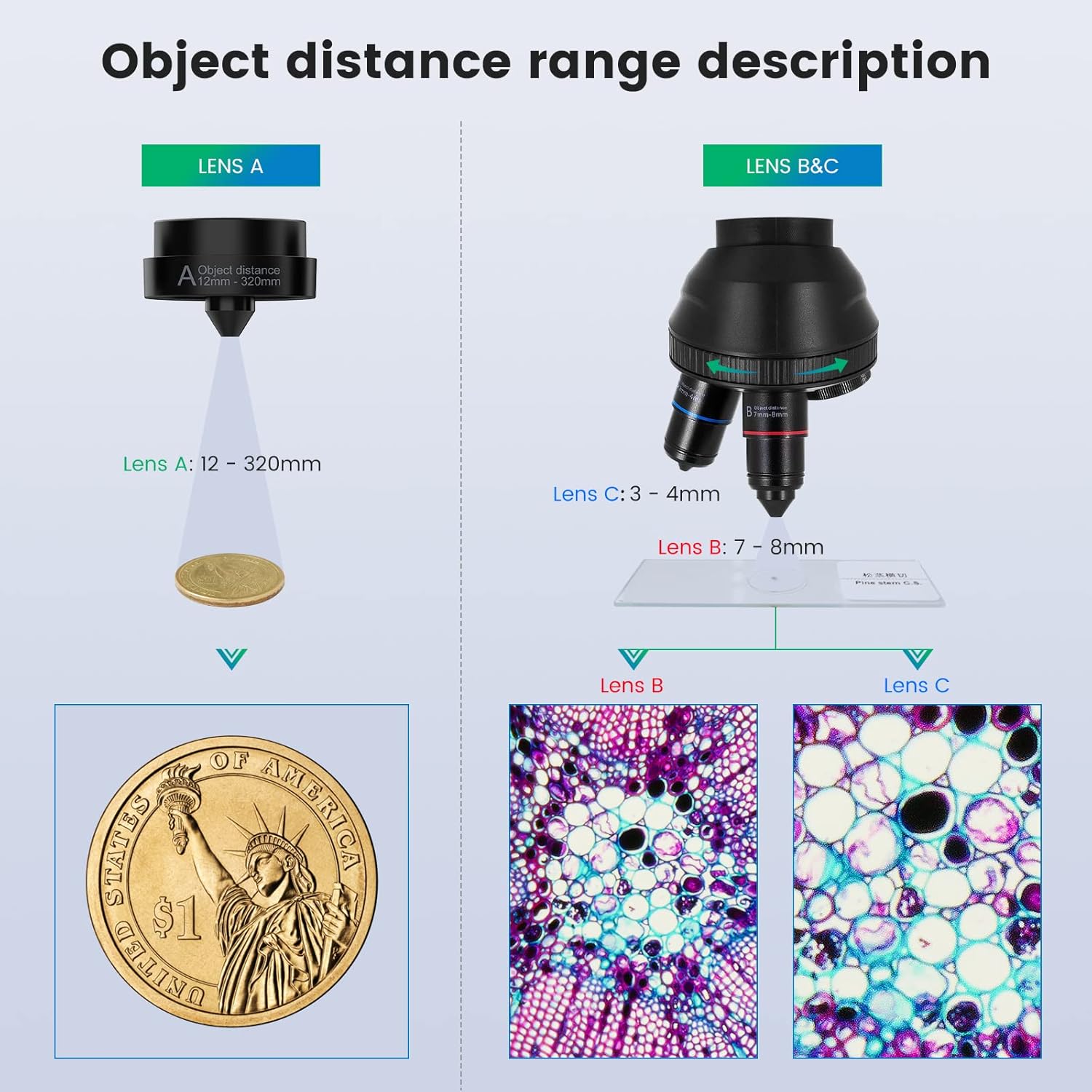 - 【3 Lens Digital Microscope with High Magnification Power】Lens A(4.5-180x) for amateurs, such as coin observation, circuit boards, plants, stones, etc. Lens B(390-510x), Lens C(690-1020x) (with 3 times digital zoom) continuous zoom for industrial and biological or slides observation. Two empty lens slots (RMS 20.2 mm) so users could use their own lens for certain use