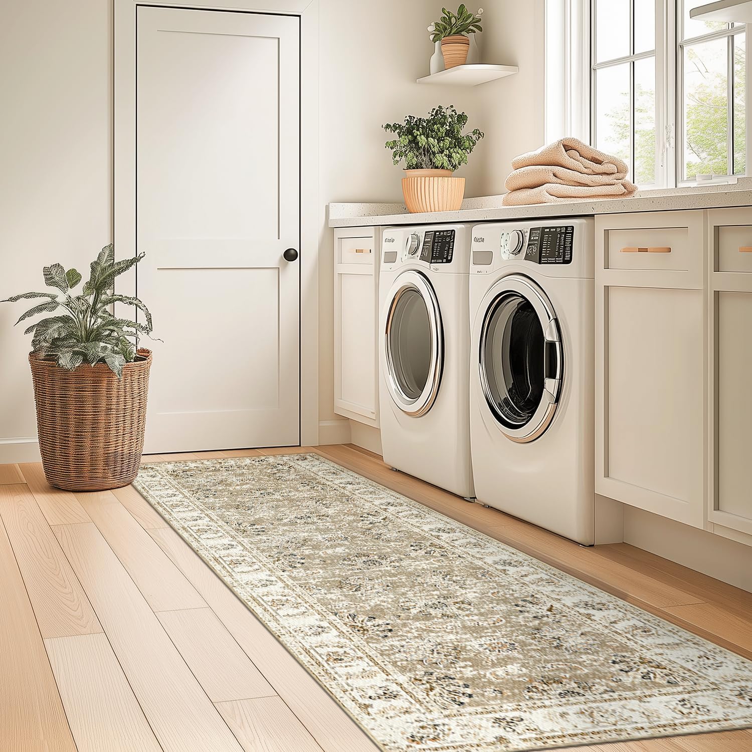jinchan Runner Rug 2x6 Machine Washable Hallway Rug Taupe Vintage Floral Print Non-Slip Low Pile Ultra-Thin for Kitchen,Entryway,Laundry Room,Bedroom,Farmhouse (2‘x6’,Taupe)