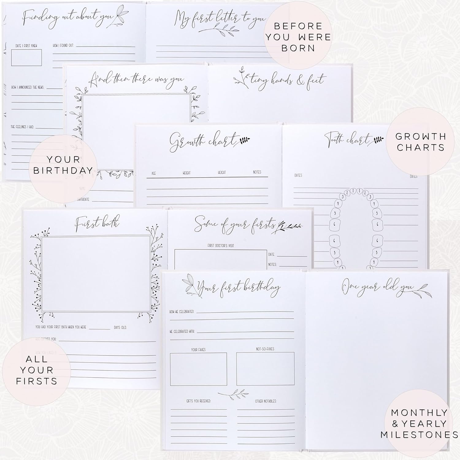 - Simple Baby Book for the Minimalist- This book is simply printed with black ink on clean, white pages. Each page is designed with hand-sketched modern leaves.