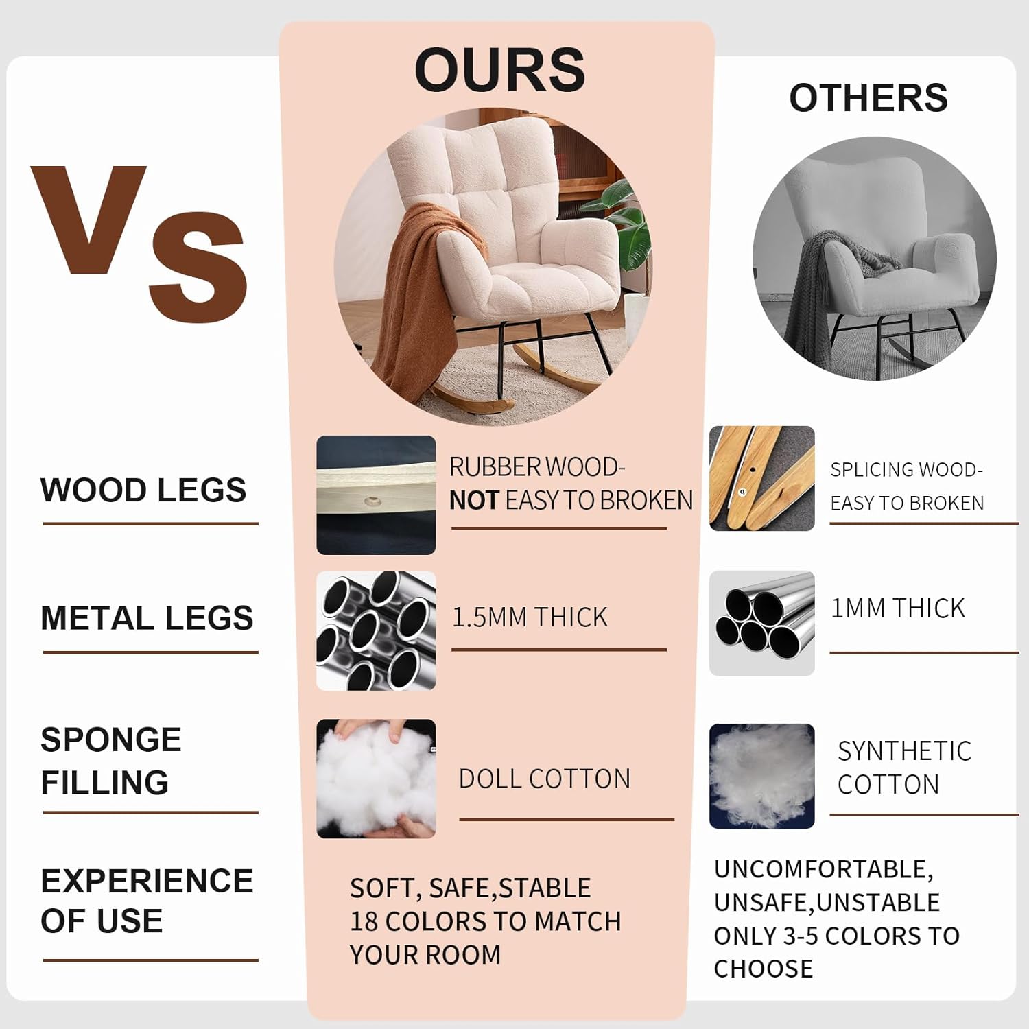 - Soft & Thick Seat - The high back and thick seat cushion are filled with sponge, which is soft, comfortable, elastic and not easy to collapse. The whole recreational rocking chair is soft enough for you to enjoy yourself and relax your body after tired work