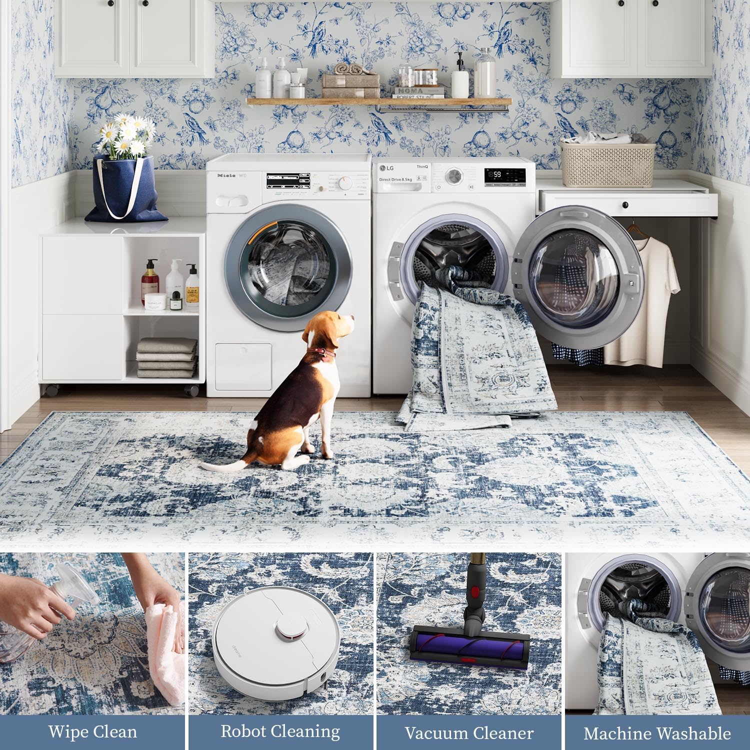 jinchan 8x10 Area Rugs for Living Room Machine Washable Vintage Floral Distressed Design Stain Resistant Boho Carpet Low Pile Non-Slip Rug for Bedroom Dining Room Home Office (8‘x10',Dark Blue)