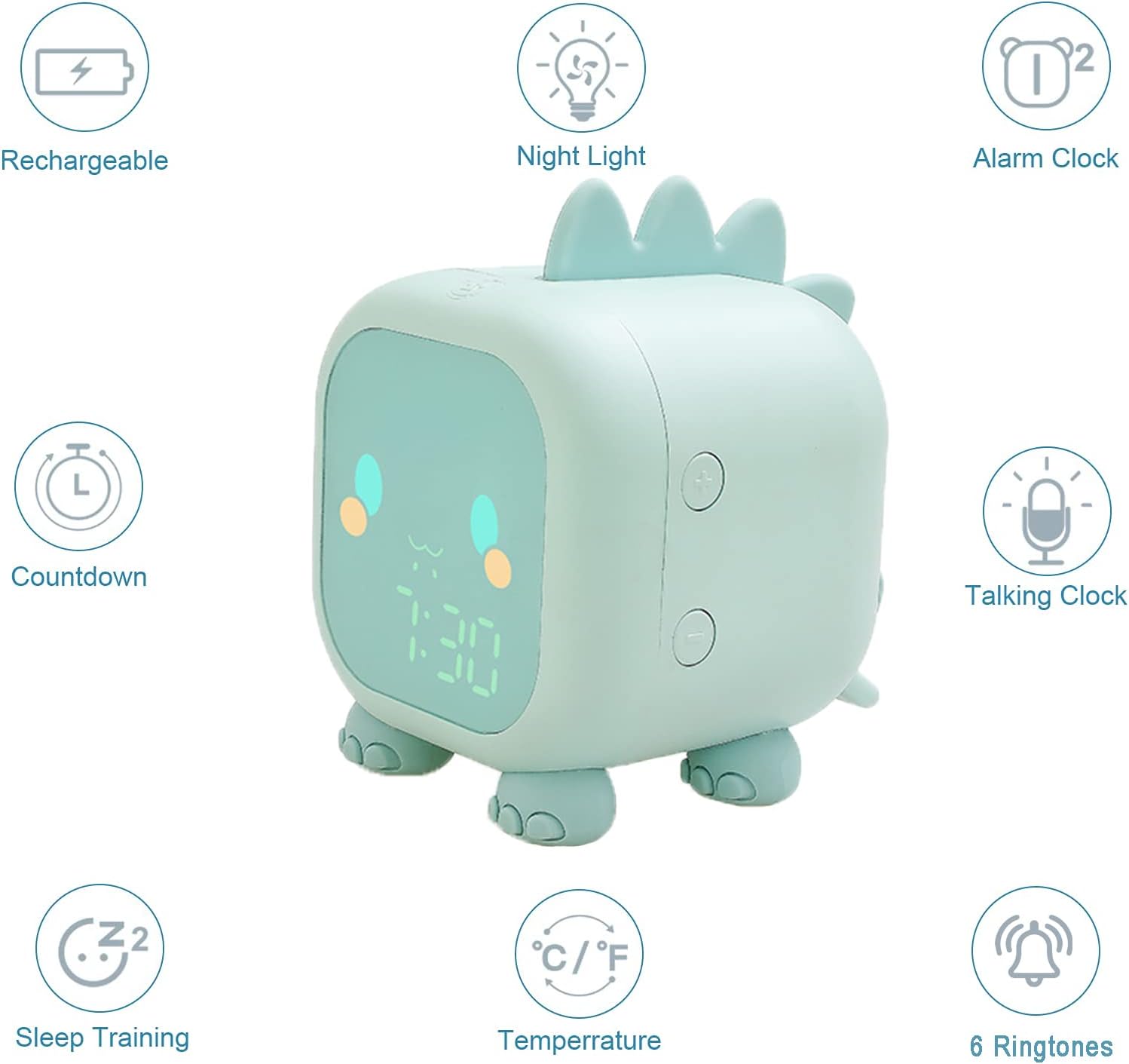 - [MULTIFUNCTIONAL DESIGN]: The cute dinosaur alarm clock not only has soft colorful lights, but also has a snooze function which can be activated by shaking the alarm clock. As well as a thermometer and 6 kinds adjustable sound modes. The dinosaur alarm clock uses rechargeable lithium-ion battery, which is more environmentally friendly and energy-saving.