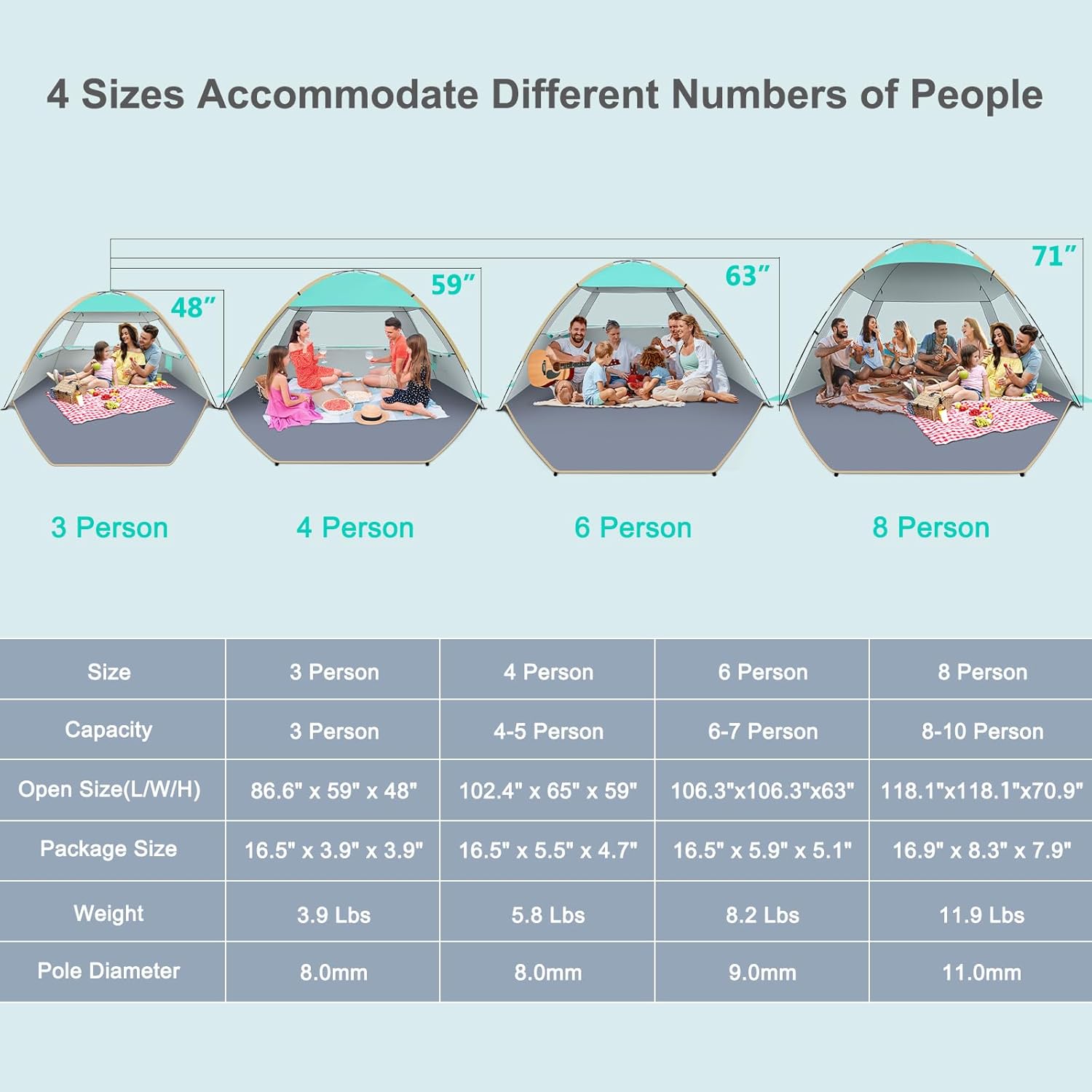 - Super Large Space: Size of 86.6"L x 59"W x 48"H, 30% bigger than other POP-UP tent at similar price, fits 3-4 person. It provides a comfortable space for family and friends on the beach