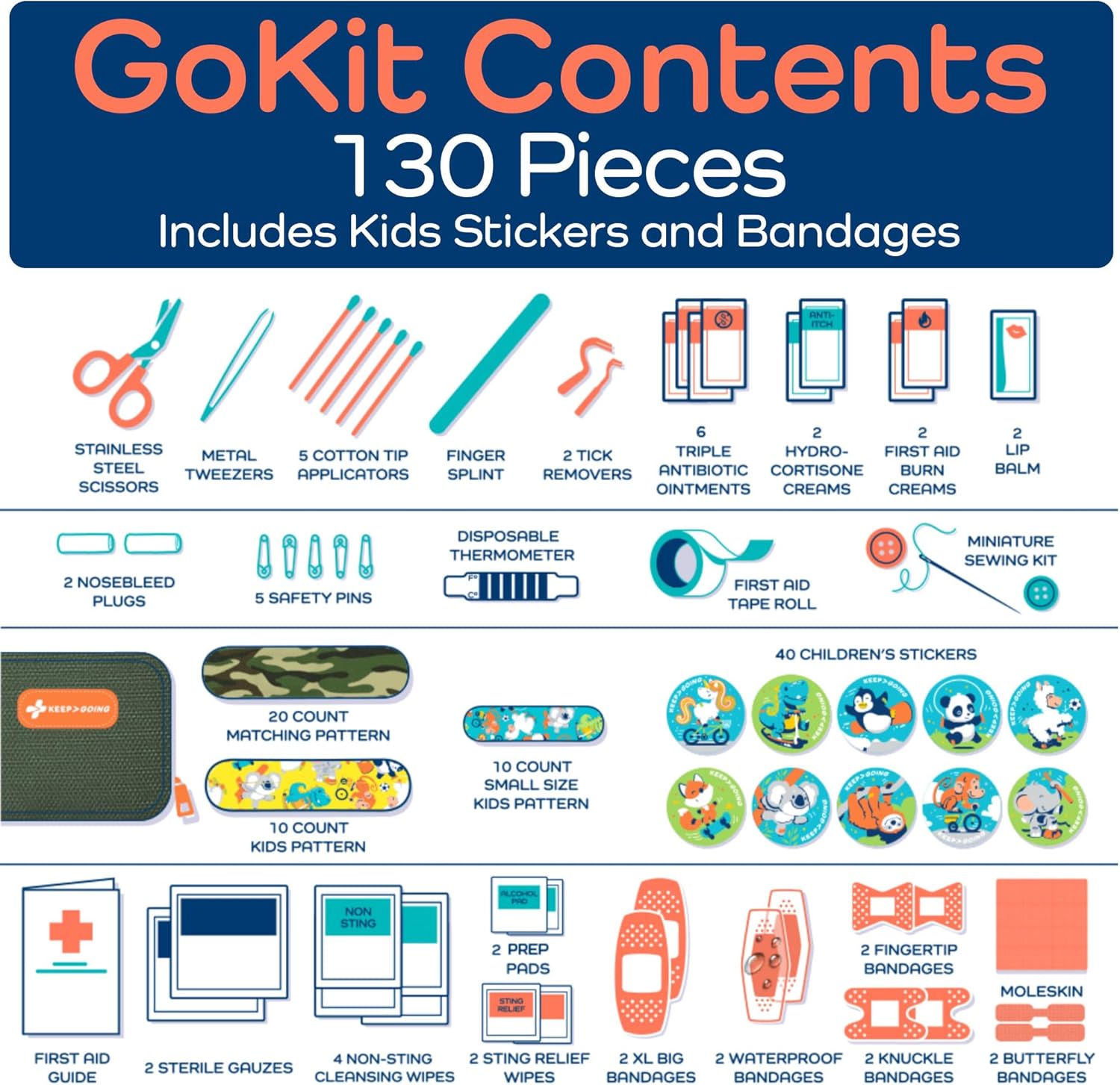 Keep Going Travel First Aid Kit for Kids – 130 Pc. for Car, Purse, Diaper Bag, Backpack, & Suitcase, with Latex-Free Bandages – 7 x 5 x 2 in. Travel First Aid Kit TSA-Approved