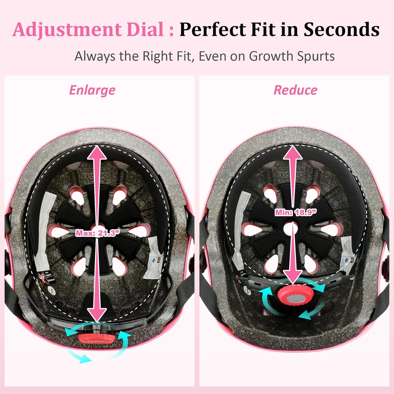 - 【Adjustable Kids Toddler Helmet Set 】- The helmet for kids has an adjustable knob in the back, can easily adjust to a perfect fit for kids, Helmet head circumference: 48-54 cm/18.9"-21.3", suitable for toddlers aged 3-5 and kids aged 5-8, one bike helmet set can be used for a few years