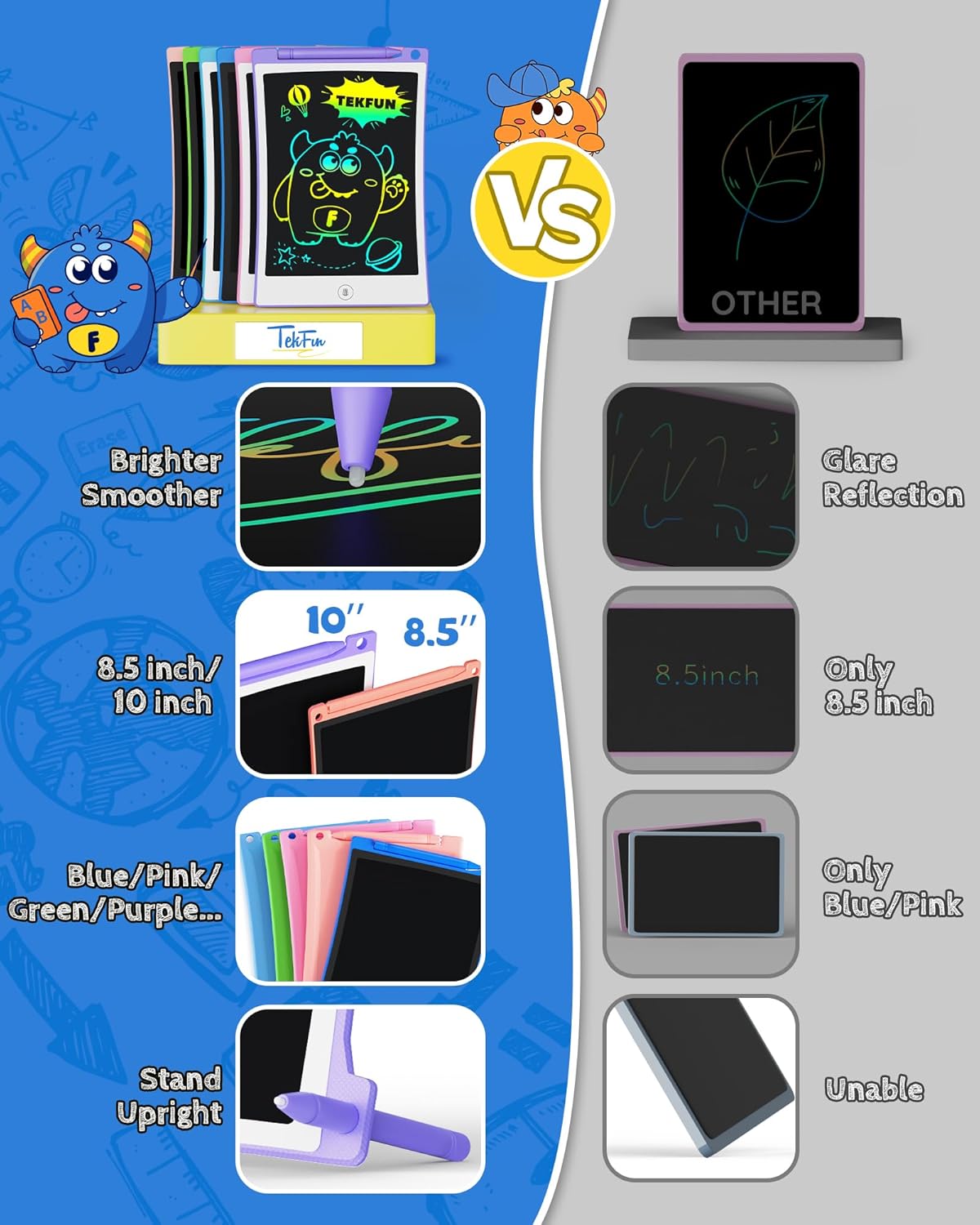 - Eye-protecting Colorful Screen: Eyes Are The Window To The Soul. Too much screen time on electronics will hurt kids' eyesight. The TEKFUN doodle board LCD screen with no blue light, no glare, radiation-free, but can depict a dreamy and colorful world and writes in "rainbow". Eyes will not be tired at all even for long-time use.