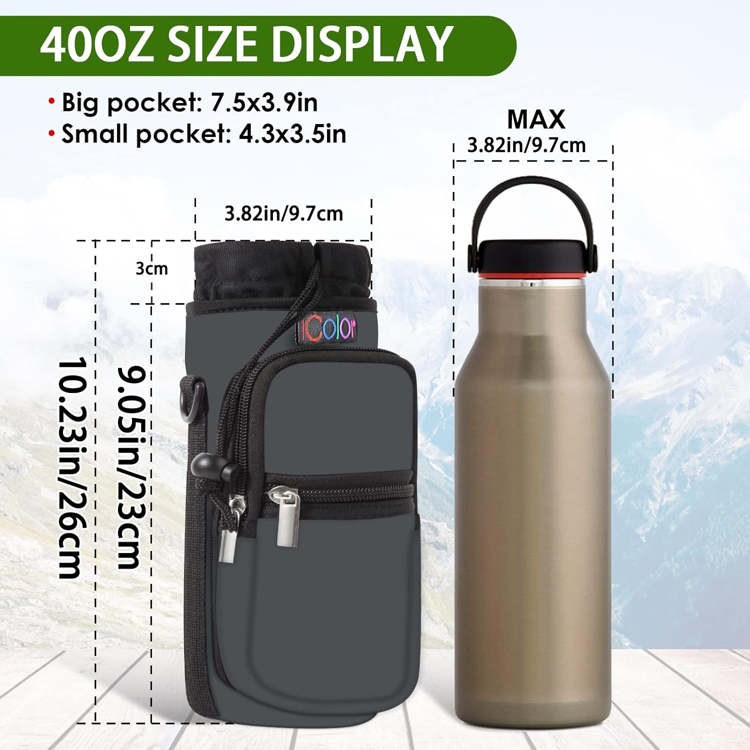 • icolor Wide Mouth Water Bottle Carrier Holder Pouch with Call Phone Bag have 4 size 25oz(Diameter 3.23",Height 9.05")/32oz(Diameter 3.82",Height 7.87")/40oz(Diameter 3.82",Height 9.05")/64oz (Diameter 5.12",Height 9.06"),Adjustable Padded Shoulder strap about Min:27.1, Max:48.4"