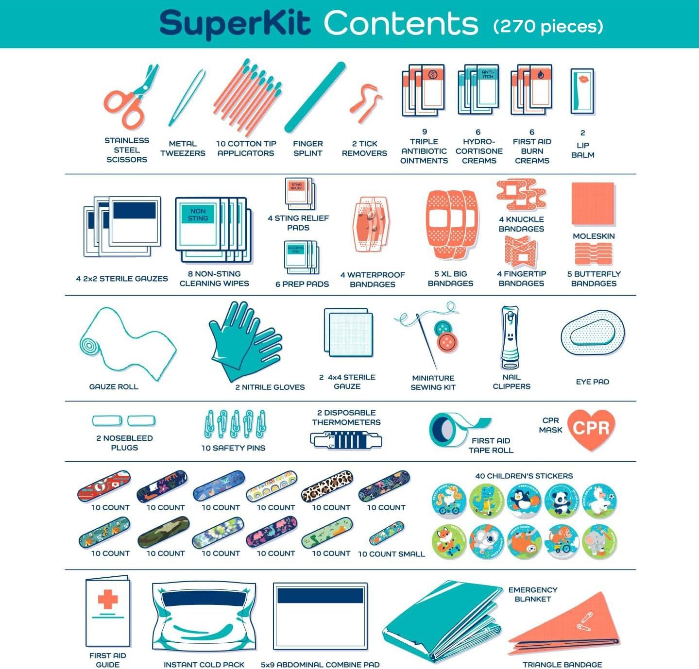 - All You Need – Good things come in complete packages! Your large first aid kit has 270 pieces of essential first aid supplies for every ouchie. From burn relief to bandages, you’ll be ready for anything.