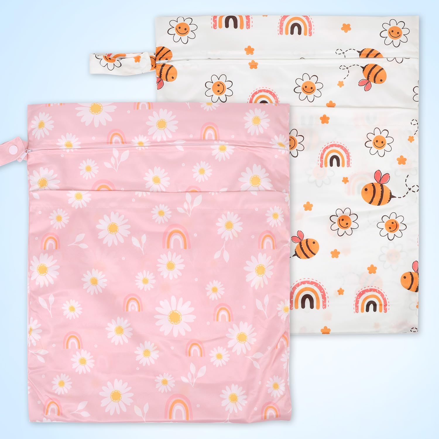 - 2 ZIPPERED POCKETS & HANDLE DESIGN: The 2 pack laundry bags are designed with 2 zippered compartments to keep wet and dry clothes separately, or separate dirty and clean diapers. Keep dry and clean. There's a handle with a button on one side for hanging up, convenient to carry and attach to your stroller, doorknob, towel rack, hook or handbag.