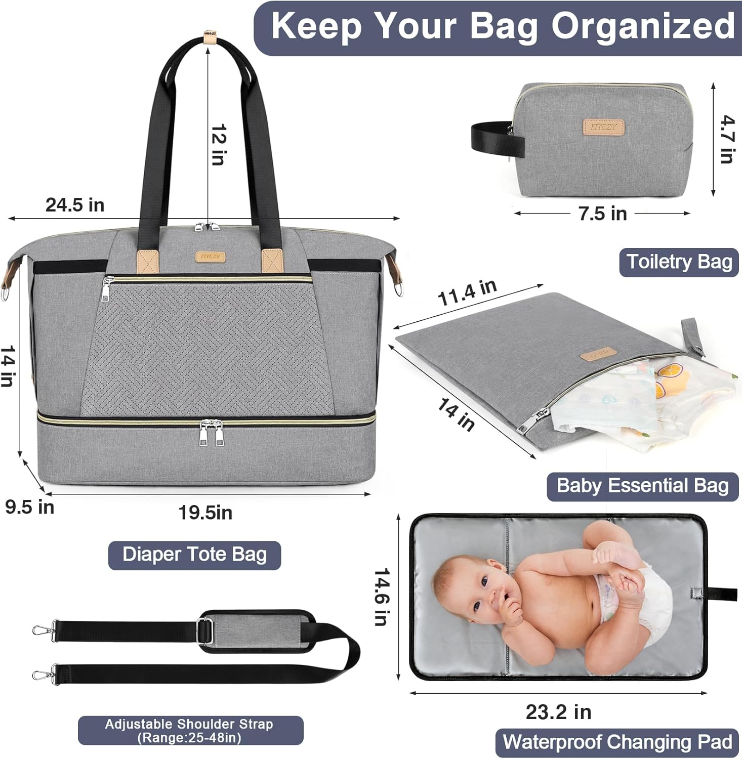 - Convenient Carry on Diaper Bag: Our large diaper bag equipped with an adjustable shoulder strap and thickened support, easily converts from a shoulder bag to a cross-body bag. This diaper bag tote is equipped with 2 baby stroller straps, you can hang the mommy bag on the stroller and free your hands. And a handy luggage sleeve at the back could slide over the carry-on luggage handle easily.The tote bag is a great choice for parents who need a diaper bag for traveling with their baby.
