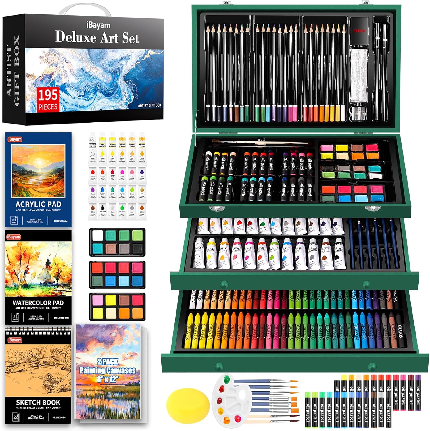iBayam Art Kit for Kids Teens Teenage Adult, 195-Pack Drawing Coloring Sketching Art Supplies Set for Cards Rocks Eggs Canvas Ceramic Wood Anime, with Canvases, Sketchbooks, Watercolor & Acrylic Pads
