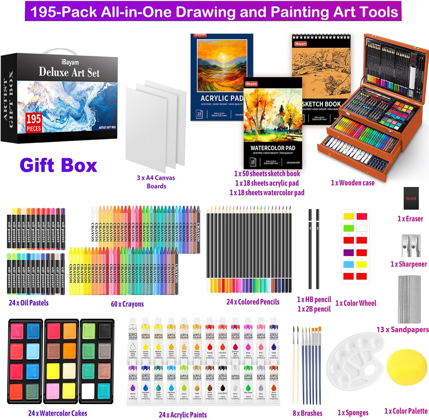 iBayam Deluxe Art Set, 195-Pack Artist Gift Box, Arts and Crafts Drawing Painting Kit Art Supplies for Adults Kids, Art Kits Paint Set with 24 Acrylic Paint, Sketchbook, Canvases, Crayons, Pencils