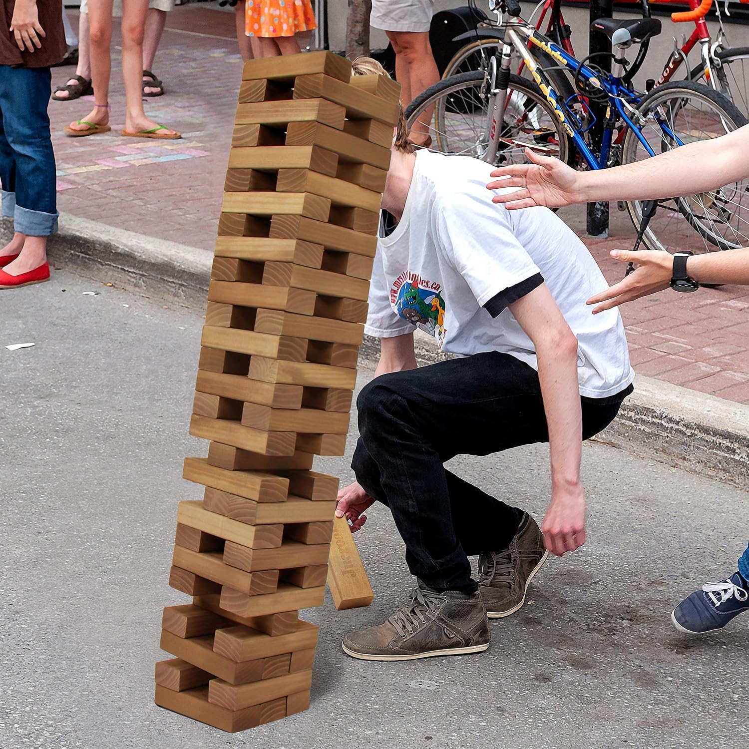 - Giant Size Timber Game Set: Juegoal large size brown color giant tumble tower set comes with 54 pieces wooden tumble blocks, 1 pcs game board with pen and a zipper bag. Each block is 6.9 x 2.3 x 1.2 inch, 2FT (18 rows) could be grown up to 4FT tall tower when played. A great fun, fast-paced stacking game and indoor or outdoor playing game for all ages