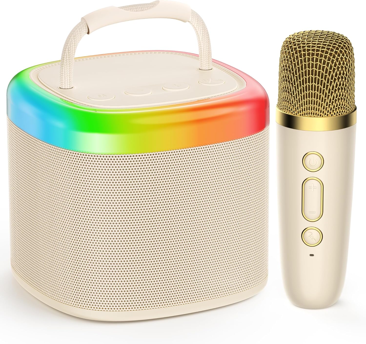 JYX Mini Karaoke Machine for Kids - Beige Bluetooth Speaker with Party Lights and 1 Wireless Microphone, Great for Kids and Adults, Ideal for Family Home Parties and Birthday