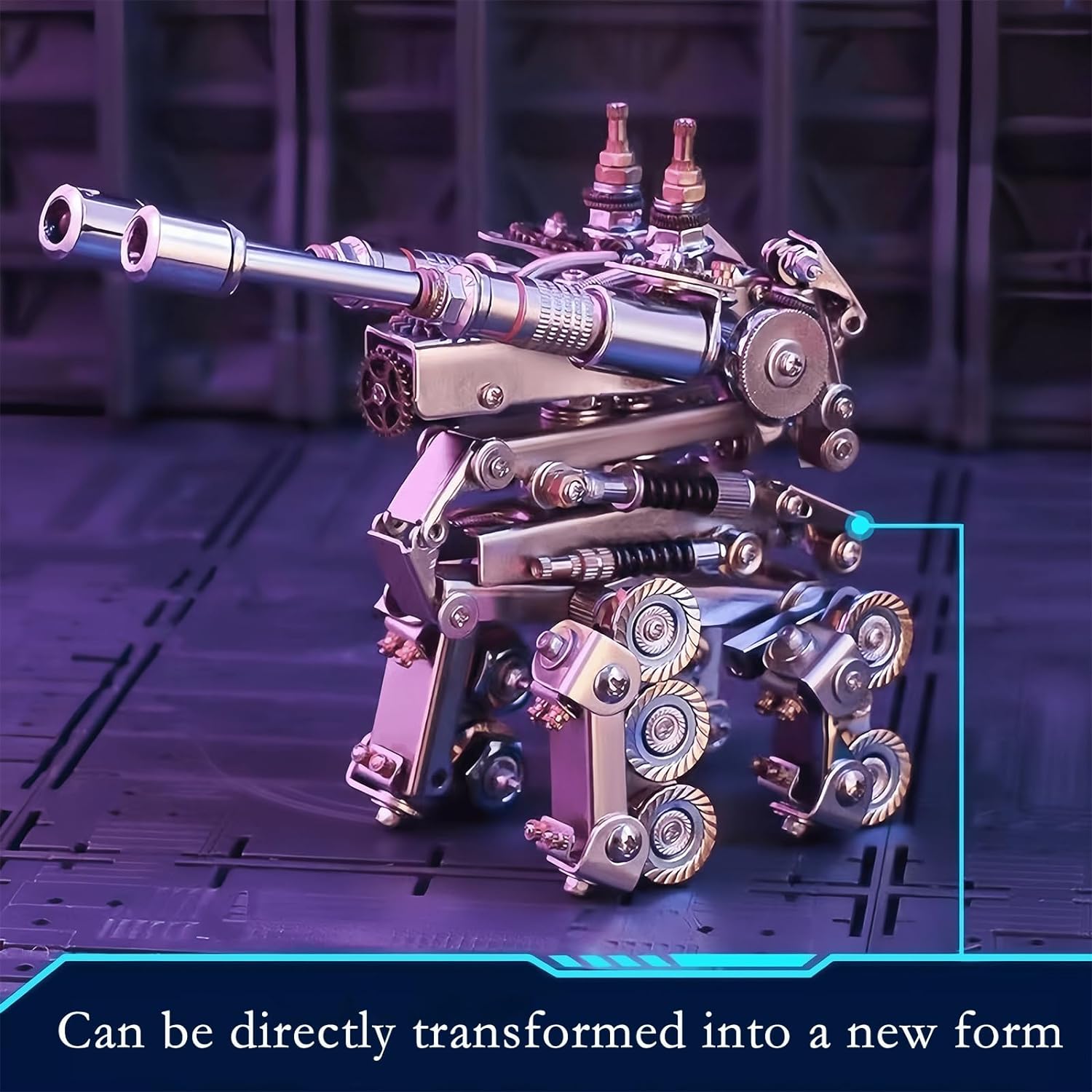 - Design Highlights : This mechanical metal tank can rotate the turret 360 °, with a multi angle folding body that can be directly deformed into various new forms, or can be transformed into a desktop phone stand. After assembly, the size is 5.9x3.55x2.36 inches, which is very suitable for office desktop decoration or home decoratio