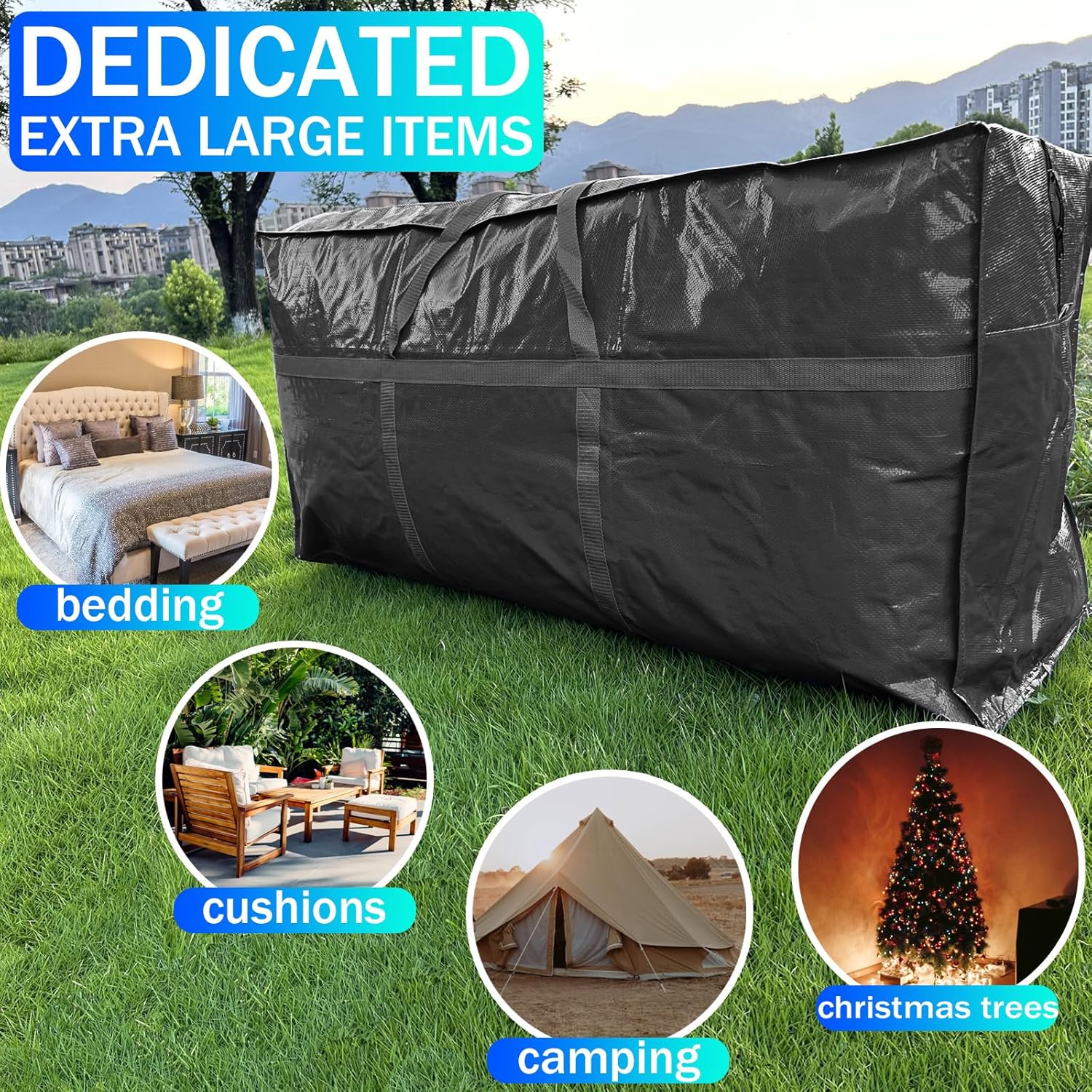 • MULTIPURPOSE: This extra large storage bags can serve so many purposes!! Used for moving, storing, transporting, camping, traveling, organizing, space saving etc. Great container to place clothes,quilts, pillows, christmas trees, decorations, bedding, sofa cushion, patio cushions, bed sheets, mops, vacuum cleaners, carpets and sports tools in during a residential move. Also suitable for garage, closet, basement storage and organizing camping equipment.