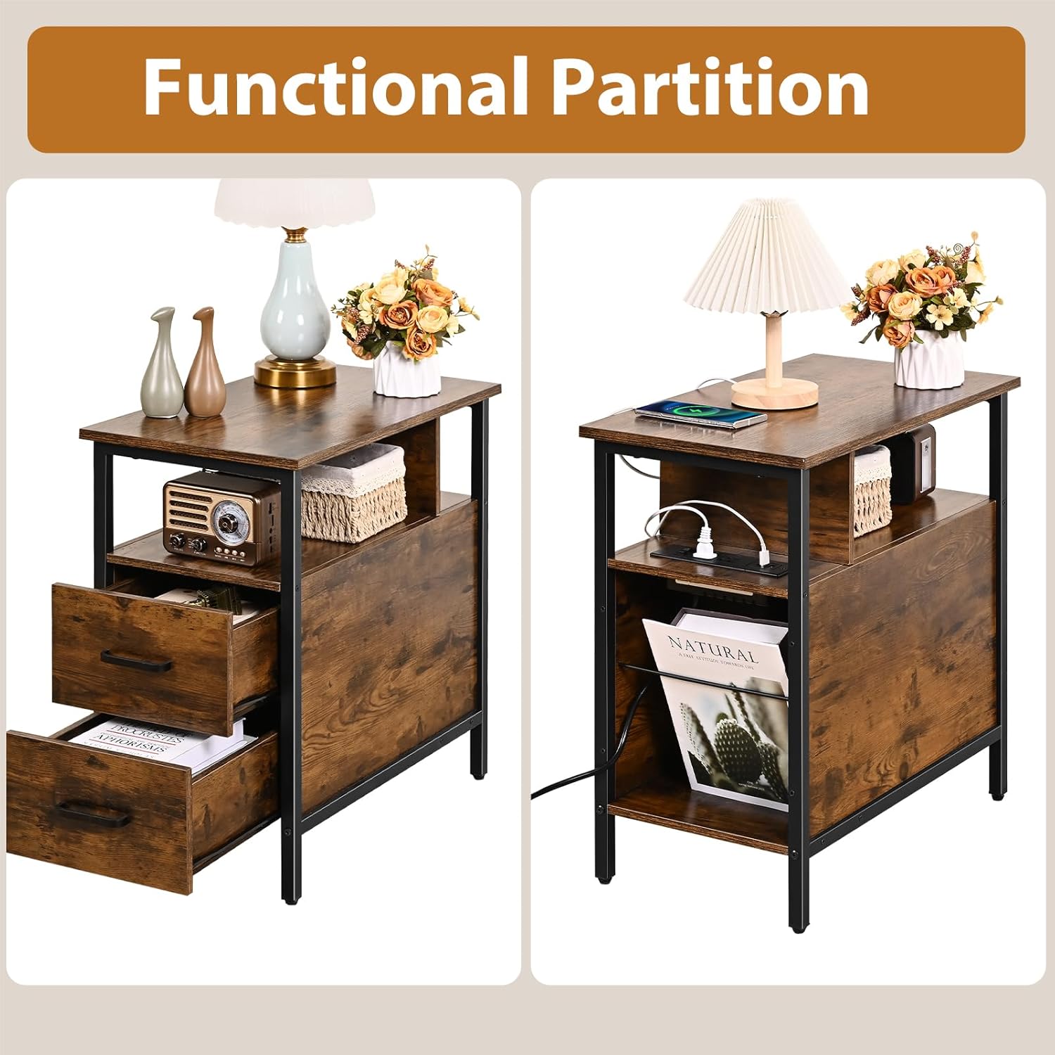 - Versatile End Tables: Our skinny end table is divided into three functional sections, open storage shelves, charging area and wood drawer storage. So this multifunctional end table also can be as nightstands, bedside table, office desk and printer stand.