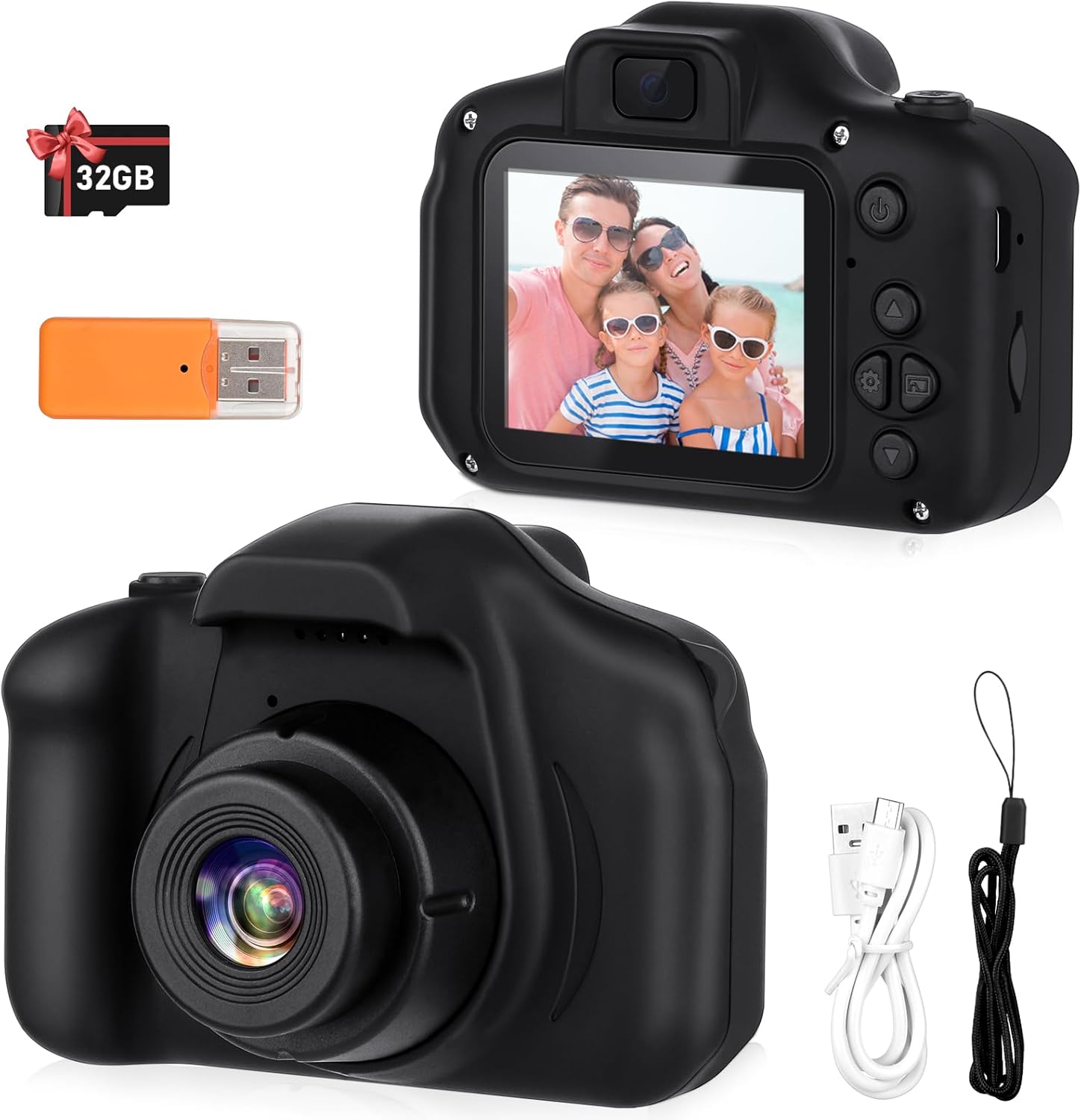 Kids Camera,HD Digital Video Camera,Childrens Toys for 3 4 5 6 7 8 9 Year Old Boys/Girls,Selfie Camera for Kids,Christmas Birthday Gifts with 32GB SD Card (Black)