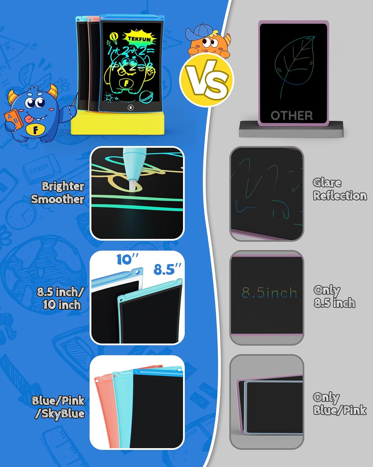 - Eye-protecting Colorful Screen: Eyes Are The Window To The Soul. Too much screen time on electronics will hurt kids' eyesight. The TEKFUN doodle board LCD screen with no blue light, no glare, radiation-free, but can depict a dreamy and colorful world and writes in "rainbow". Eyes will not be tired at all even for long-time use.