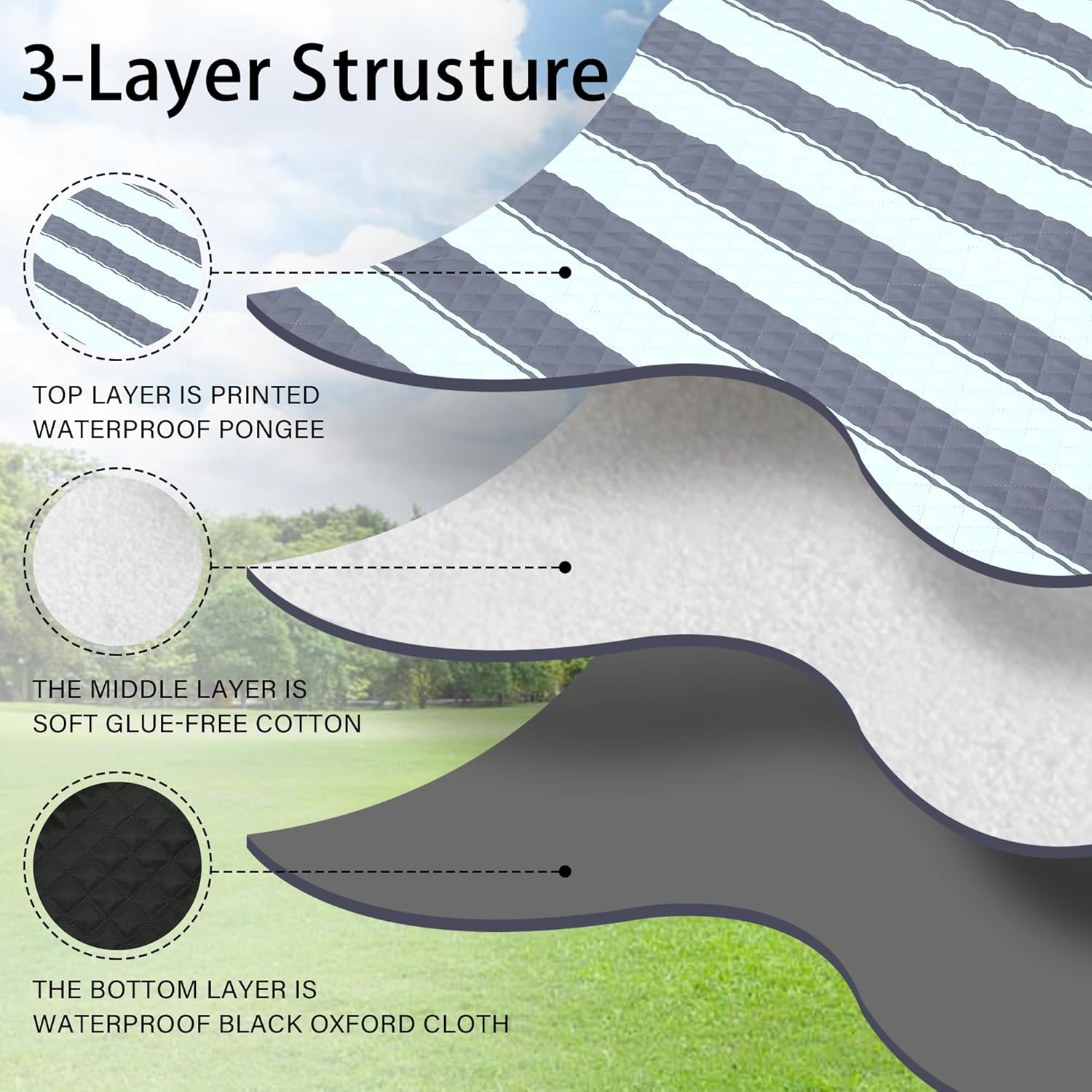 - 【Soft and Durable with 3-Layers】The picnic blanket top layer is printed waterproof pongee, the middle layer is soft glue-free cotton, and the bottom layer is waterproof black Oxford cloth. Perfectly suitable for siting or lying on grass, beach, floor or any kindly of surface, giving you soft and comfortable feelings.
