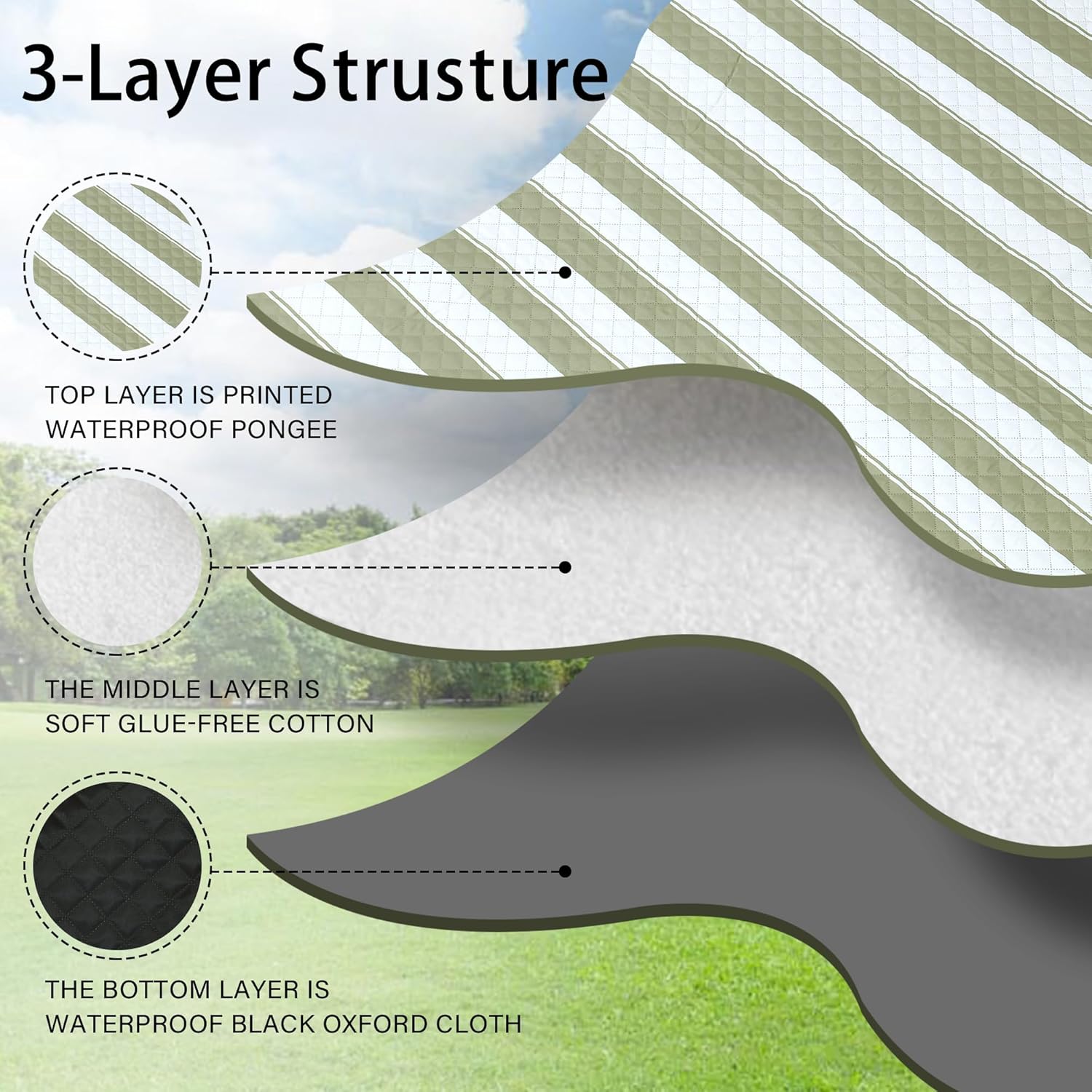 - 【Soft and Durable with 3-Layers】The picnic blanket top layer is printed waterproof pongee, the middle layer is soft glue-free cotton, and the bottom layer is waterproof black Oxford cloth. Perfectly suitable for siting or lying on grass, beach, floor or any kindly of surface, giving you soft and comfortable feelings.