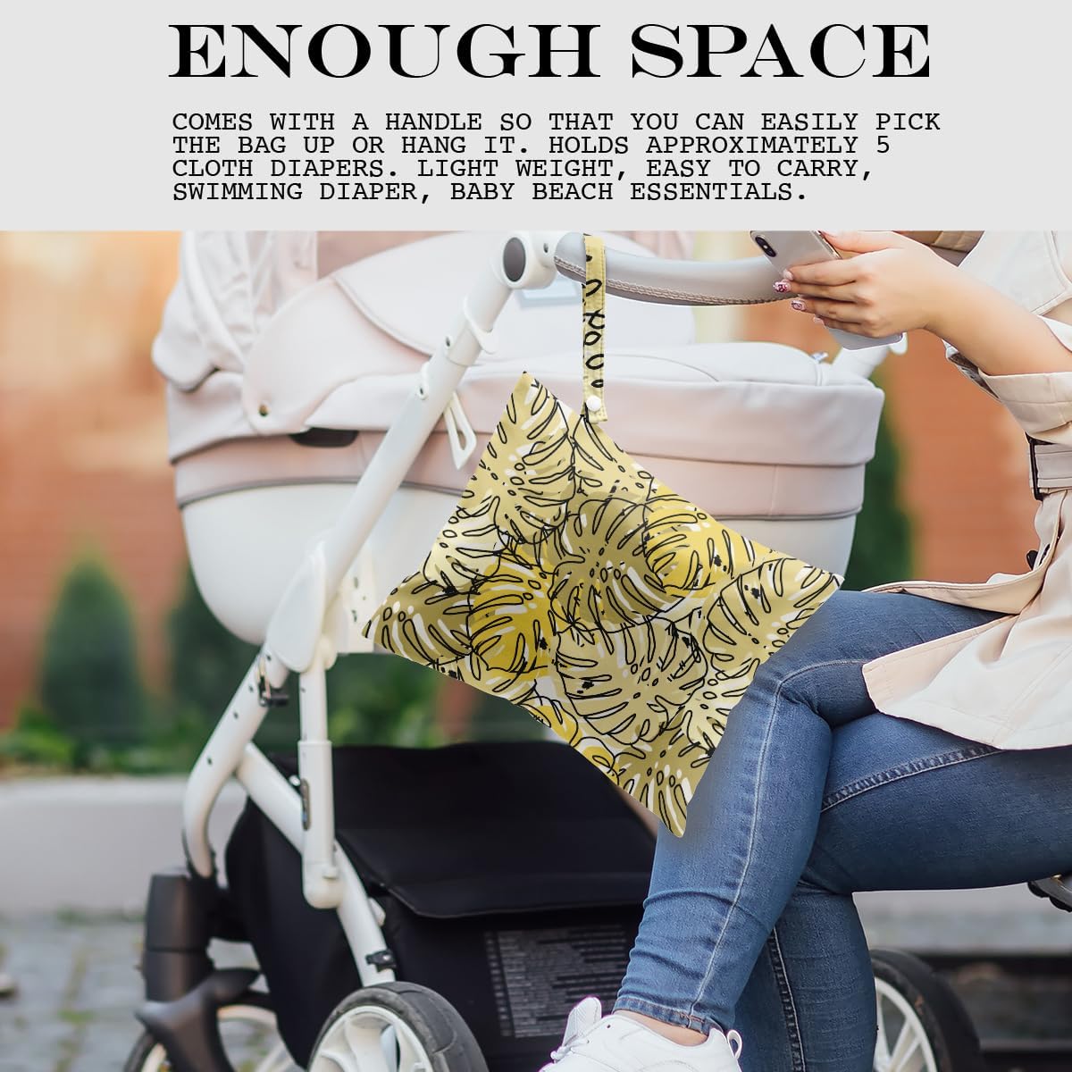 - ENOUGH SPACE - 26cm x 32cm (approx.: 12.5” x 10.2”). Comes with a handle so that you can easily pick the bag up or hang it. Holds approximately 5 cloth diapers. Light weight, easy to carry, swimming diaper, beach essentials.