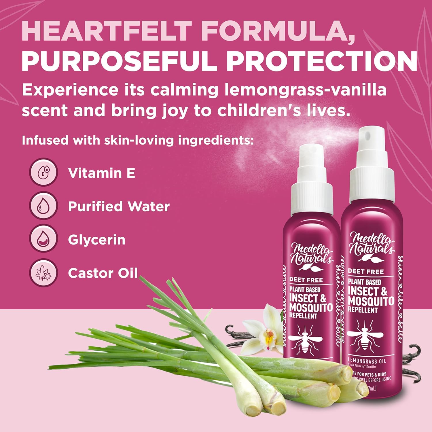 - DEET FREE INSECT REPELLENT – Unlike DEET insect repellents, Medella protects you from gnats, black flies, no-see-ums, and mosquitoes using lemongrass essential oil – no harmful ingredients. Our insect repellent spray is also grass-safe.