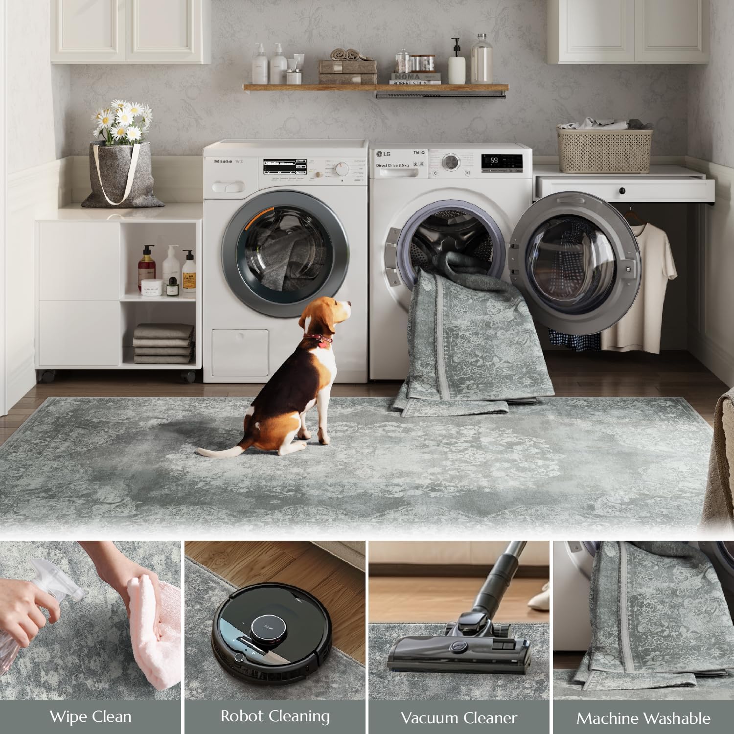 jinchan Vintage Floral 5x7 Area Rugs - Machine Washable Distressed Design Soft Ultra-Thin Low-Pile Non-Slip Carpet for Kitchen Bedroom Nursery Living Room Dining Room Home Office (5x7ft,Grey)