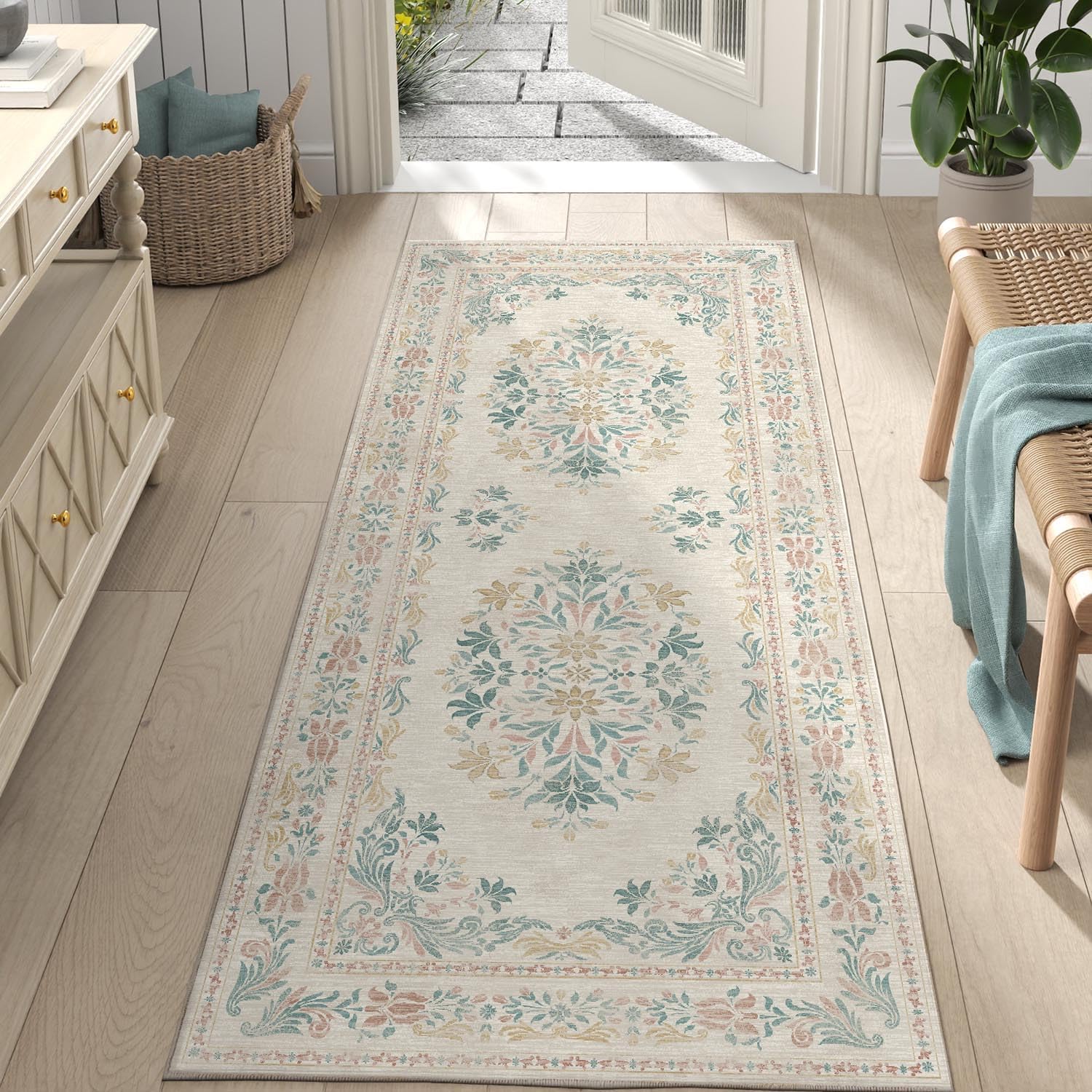 jinchan Vintage Floral Runner Rug 2x6 - Machine Washable Distressed Design Non-Slip Low-Pile Soft Thin Carpet for Hallway Kitchen Farmhouse Bedroom Entryway Laundry Room (2x6ft,Apricot Multi)