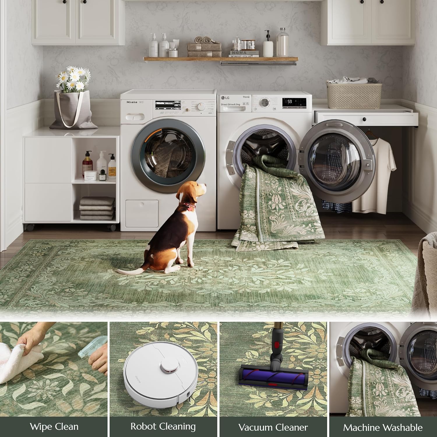 jinchan Floral 6x9 Green Area Rugs for Living Room - Machine Washable Vintage Distressed Design Soft Throw Rug Non-Slip Large Carpet for Bedroom Dining Room Home Office Nursery (6x9ft,Dark Green)