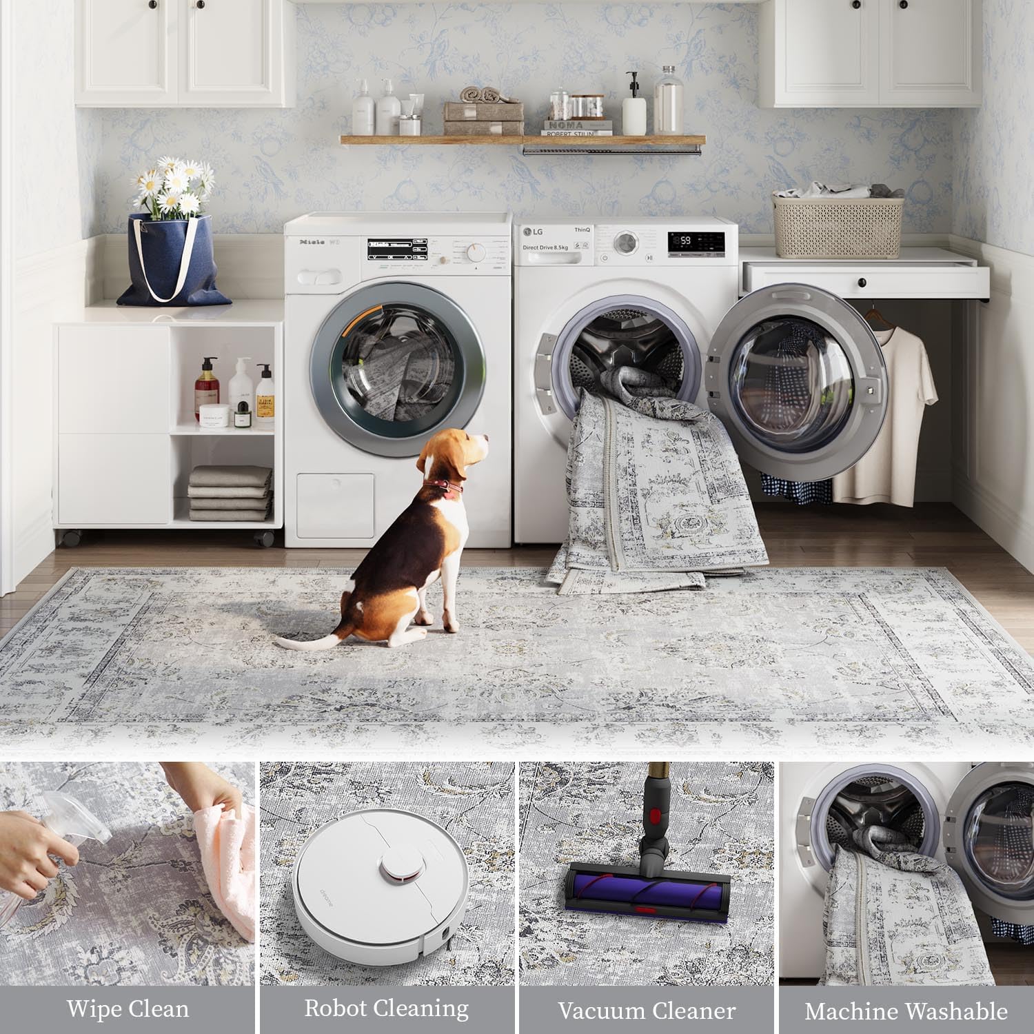 jinchan Runner Rug 2x5-2pcs Kitchen Washable Vintage Hallway Rug Floral Print Floor Cover Indoor Thin Retro Mat Accent Bathroom Laundry Room Bedroom Office Farmhouse (Double,Grey)