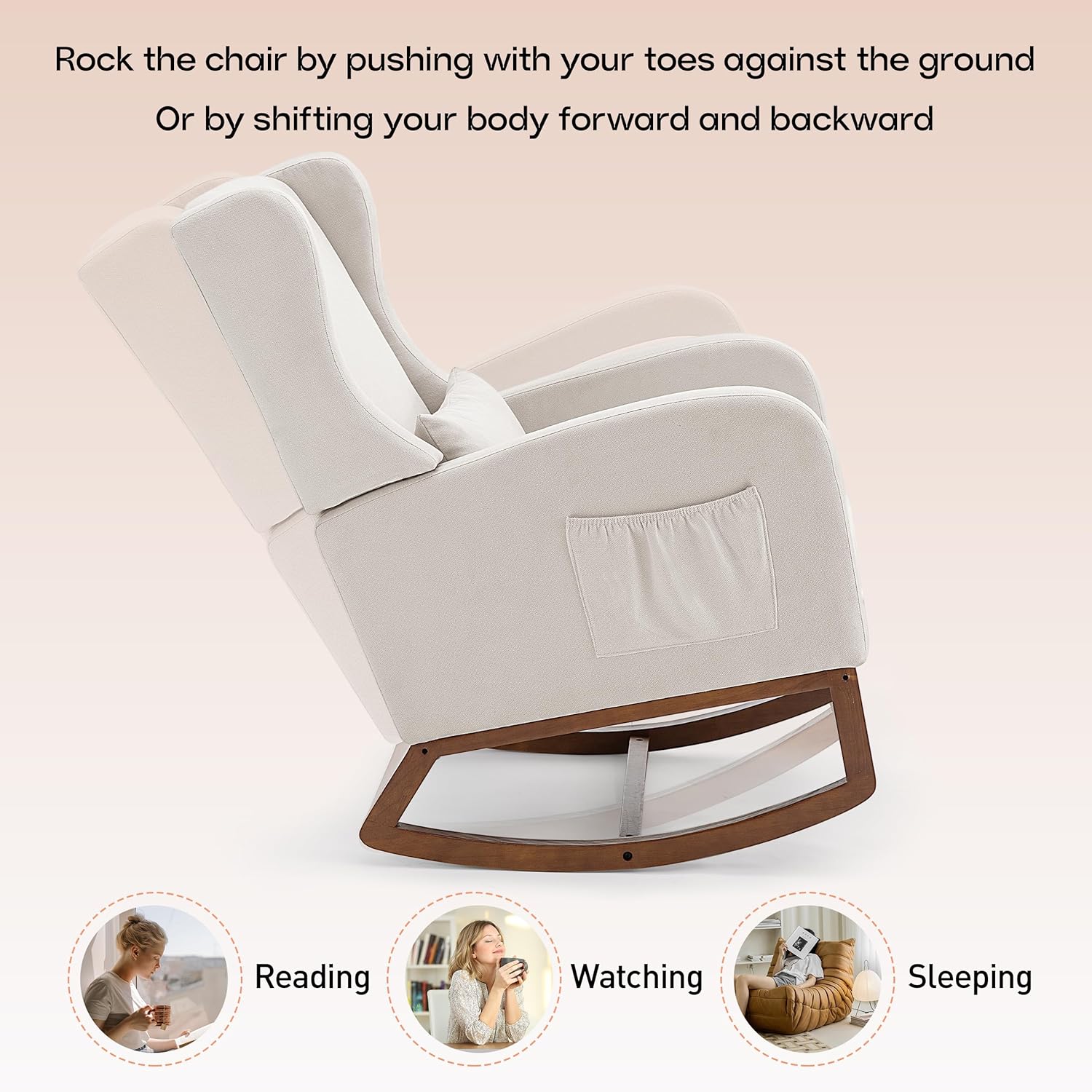 Rocking Chair Nursery Glider Chair with Foot Rest, Nursery Rocking Chairs with Rubber Wood Legs Side Pocket, High Back Nursing Chair, Accent Rocker Arm Chair Baby Bedroom, Living Room, Beige