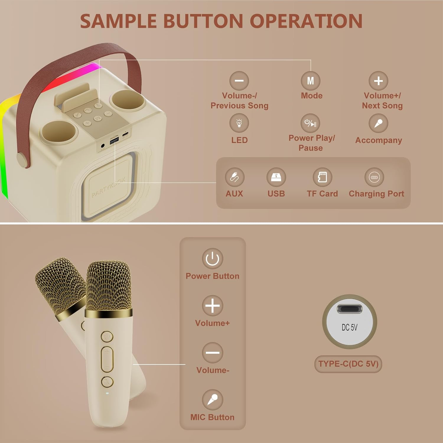 - Multifunctional Karaoke Machine: This mini bluetooth karaoke machine for kids and adults comes with two wireless microphones, offering easy operation and eliminating tangled wires. Equipped with Bluetooth 5.0 technology for instant pairing with your devices and exceptional stability. This karaoke speaker supports TF card, USB, and AUX input connections, making it compatible with a range of devices including iPhones, TVs, iPads, tablets, PCs, and more.