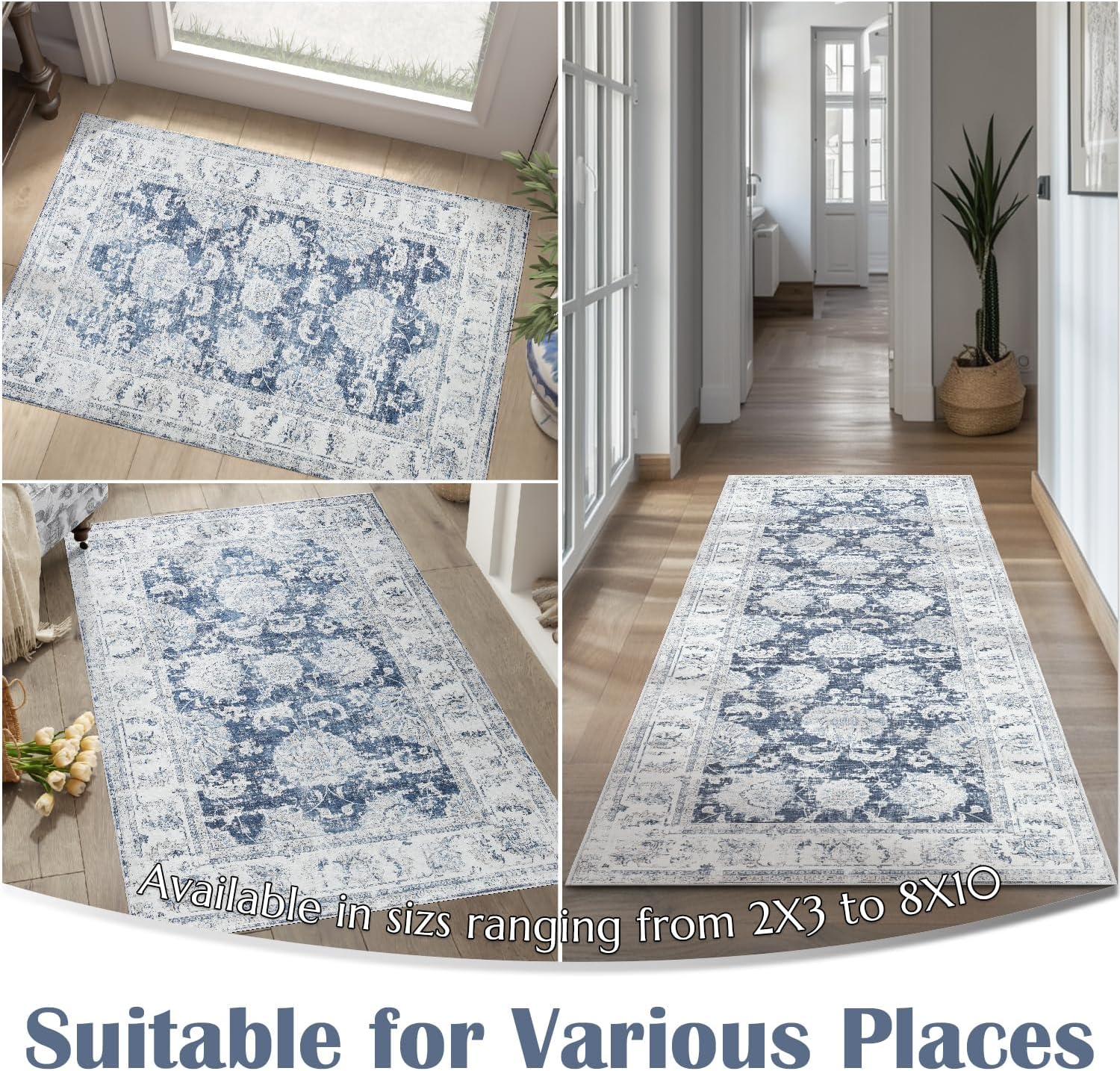 jinchan Runner Rug 2x6 Washable Hallway Runner - Vintage Floral Non Slip Low-Pile Soft Thin Kitchen Rug Distressed Carpet for Farmhouse Bedroom Entryway Laundry Room(2x6ft,Dark Blue)