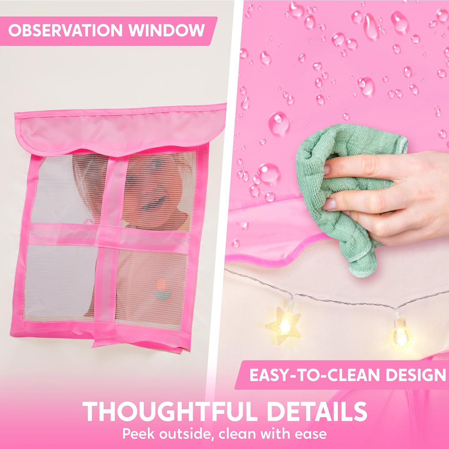 - Spacious dimensions: 51"L x 39"W x 51"H, providing ample space for kids to play and grow. The tent design is inspired by a princess castle, featuring sparkling star decorations, creating a happy, dreamy private space for children to immerse themselves in a fantasy world.